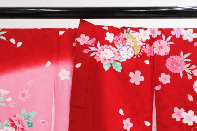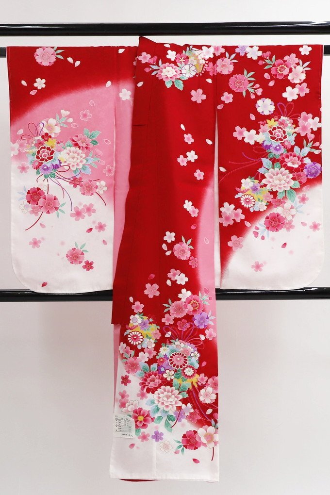 華やかな赤色系に染め上げた、可愛らしい七五三 女児(7歳用)着物です。