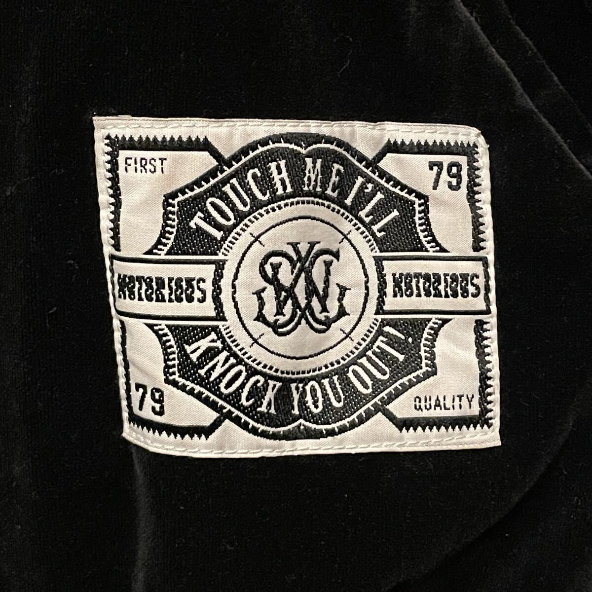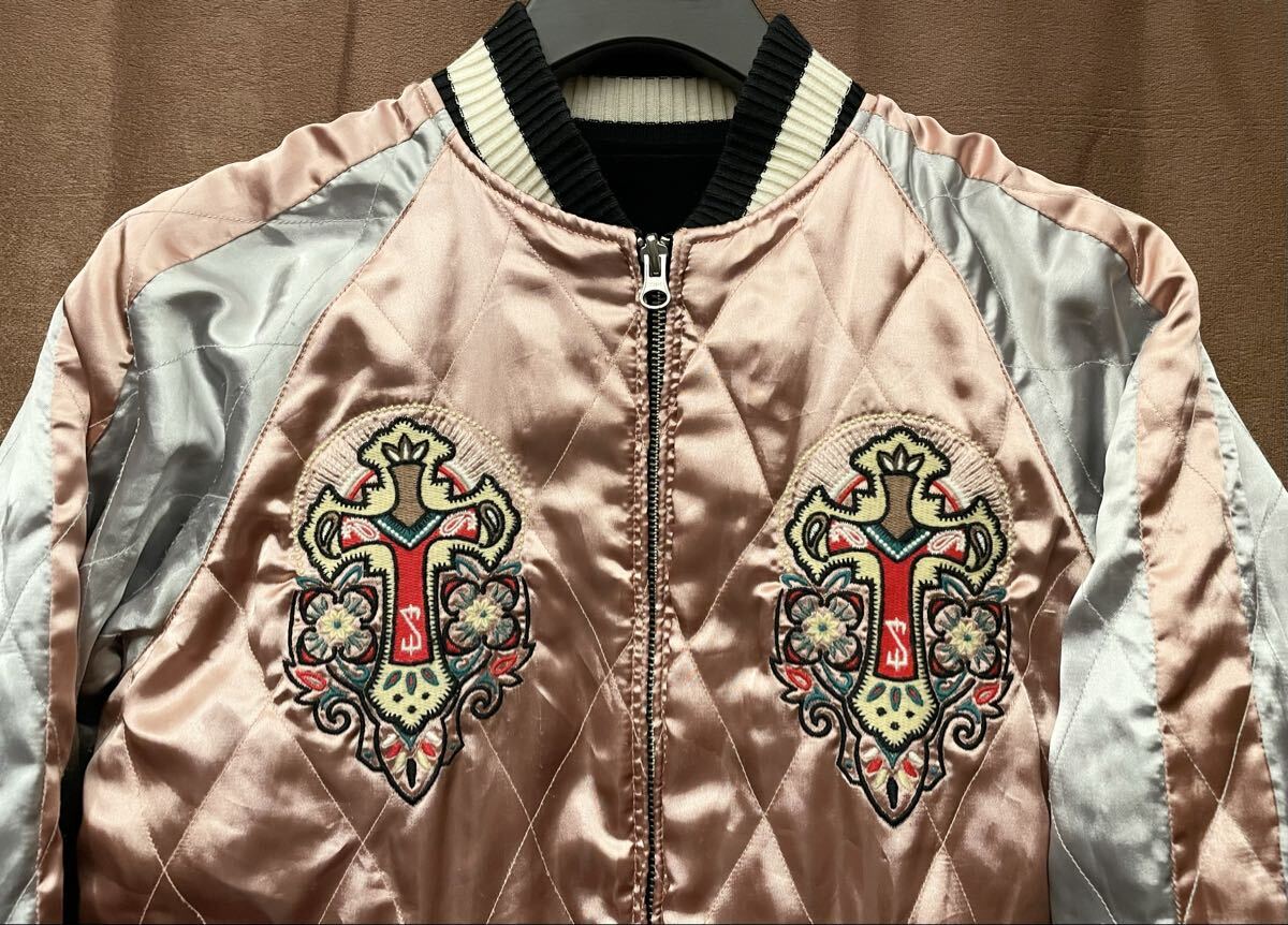 スカジャンには両胸にクロス(十字架)モチーフのオリジナルデザインの刺繍が入り、背面には伝説のラッパーBiggie Smalls(ビギ―・スモール)がラッパー名で使っているNotorious B.I.G. (ノトーリアス・B.I.G.)のNotorious(悪名高い)とSWAGGERを組み合わせた「The Swagger Notorious」の文字が刺繍されております。