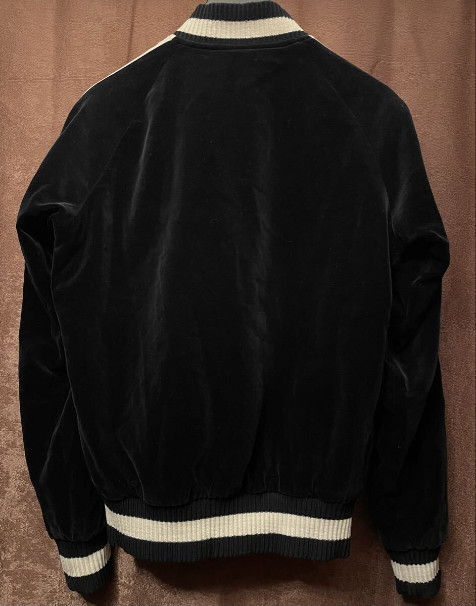 ベロアジャケットは高級感のあるブラックを基調に、両袖にホワイトのラインが入っており、左裾にブランドタグが入ったスタジャン仕様のデザインになっております。
