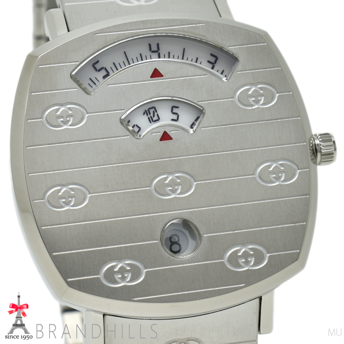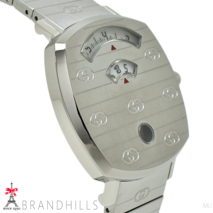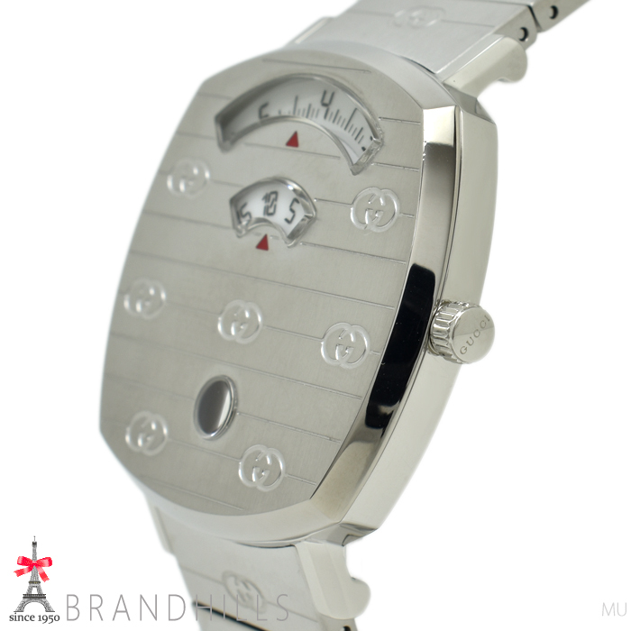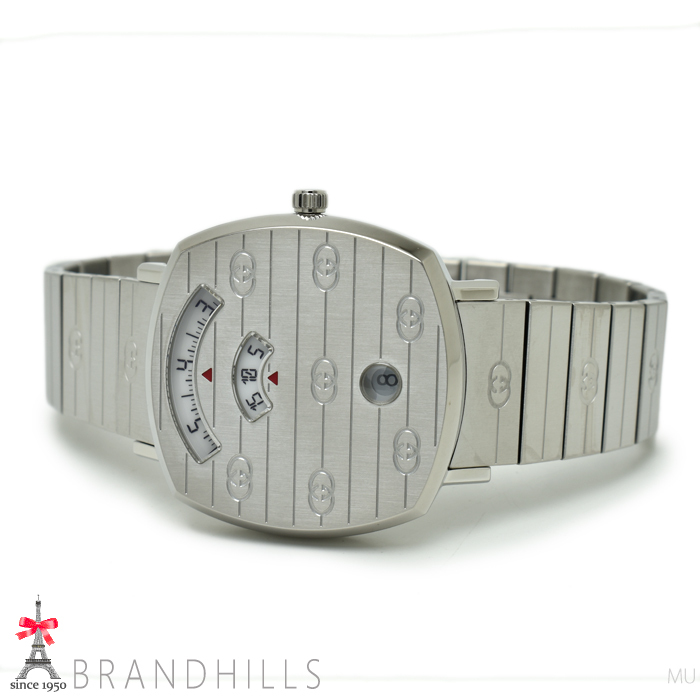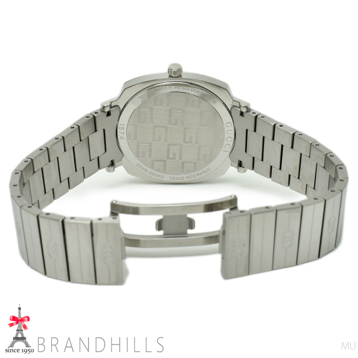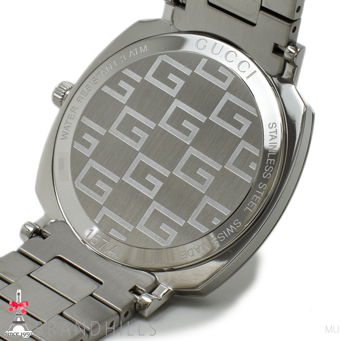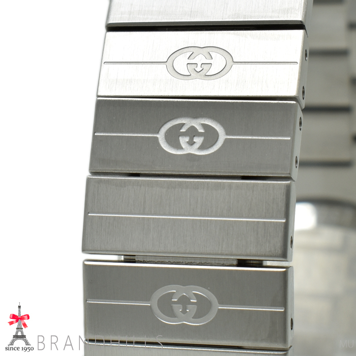 文字盤が印象的でステンレススチールでブレスレットから文字盤にまでインターロッキングGのエングレービングがほどこされたデザインです。