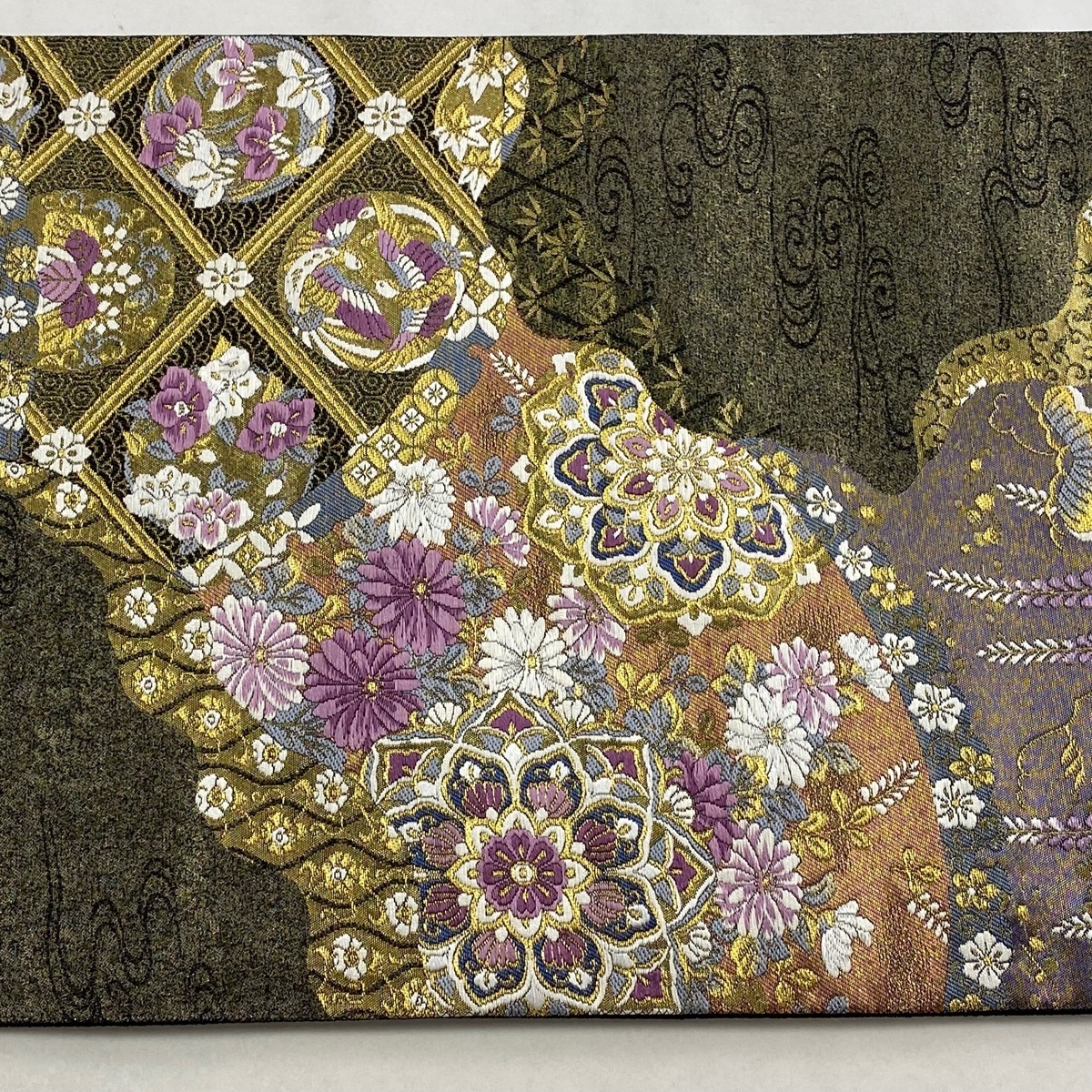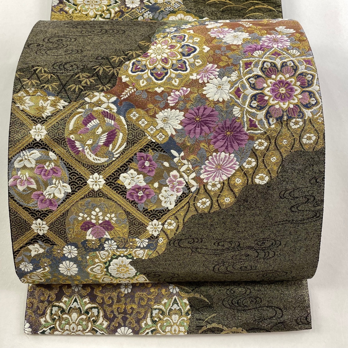| 袋帯 美品 逸品 じゅらく 落款 帝王紫 華文 花鳥 金糸 箔 金色 六通 正絹 【中古】 |