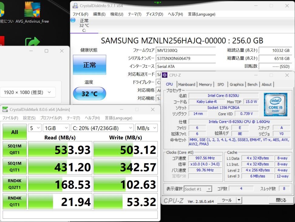 | CPU: 超高速 Intel 高性能 第8世代Core i5-8250U 1.6Ghz、 4コア8スレッド (ターボ・ブースト利用時の最大周波数 3.4GHz) |