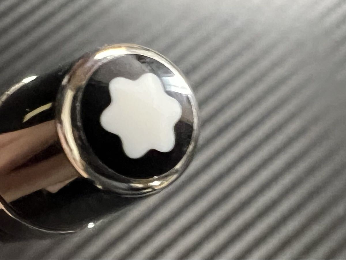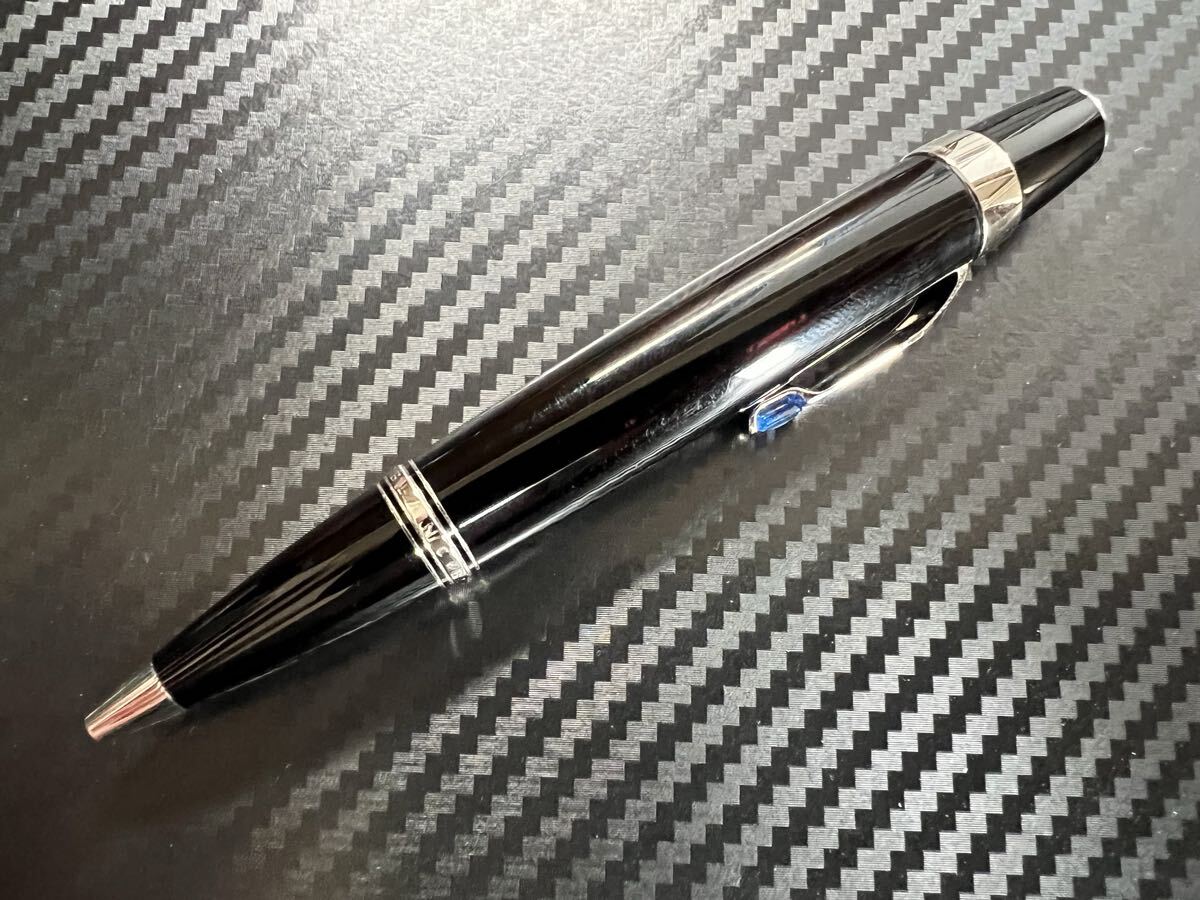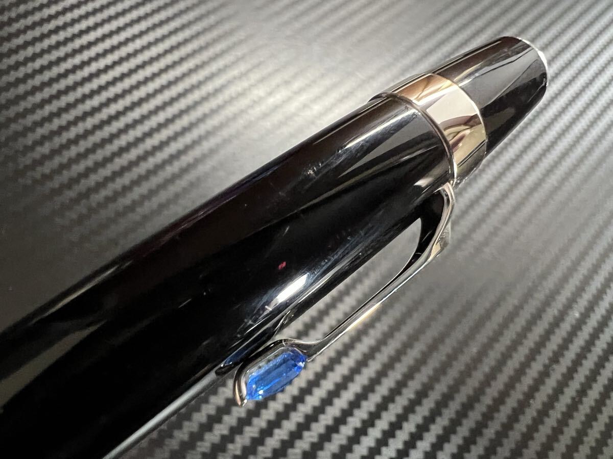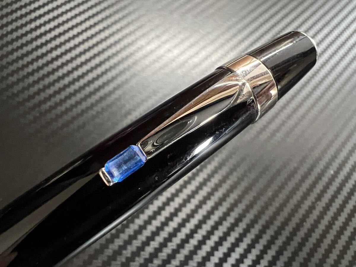 金属部がプラチナ仕上げで、クリップにはブルーの人工石が施されています。