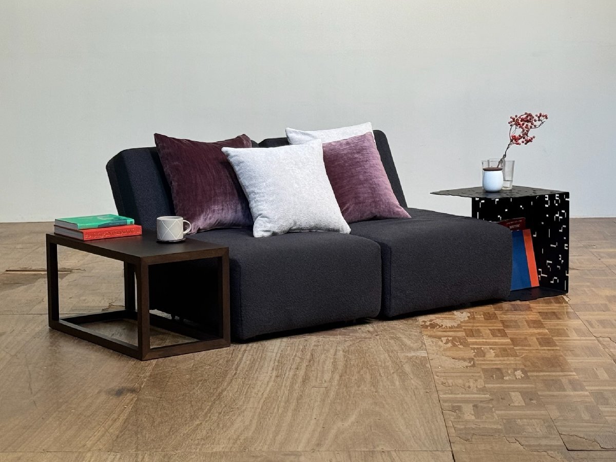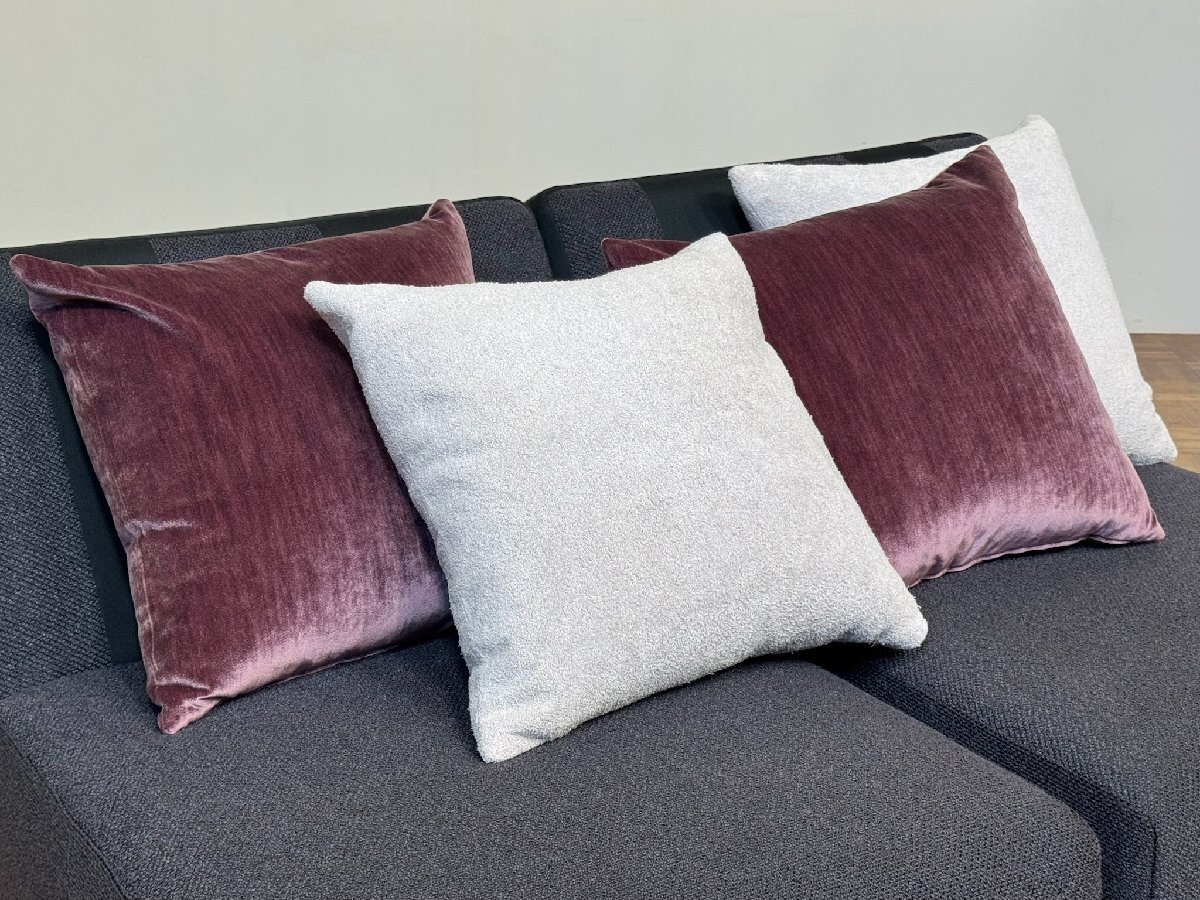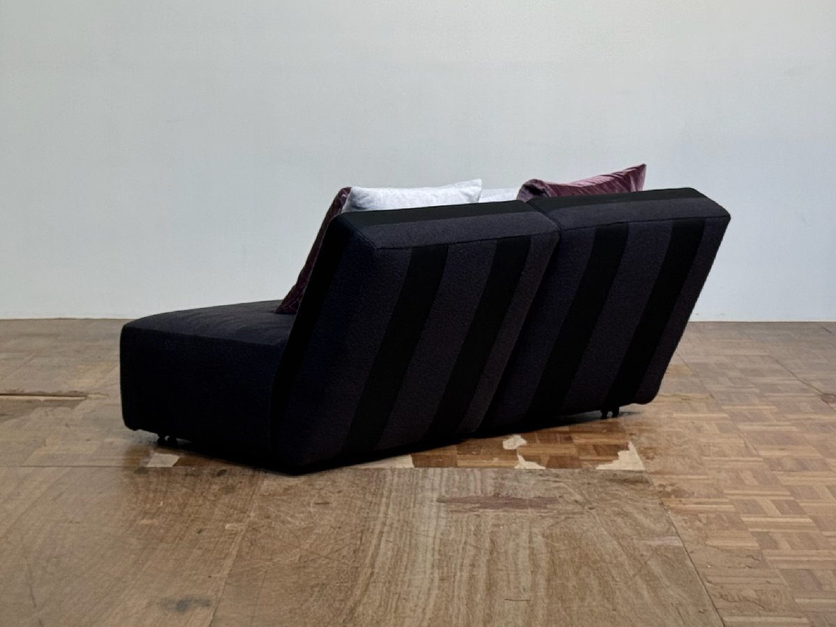 ソリッドなブロック状のフェザークッションをアイキャッチな傾斜角で組み合わせつつ、ラグジュアリーな純正クッションのカラーリングと大ぶりのストライプ柄の切り返しで飾り、インテリア内に差し込む陽光や照明によって生まれる陰影のコントラストを表現した名作シーティングクリエイション。B&B Italia / MAXALTO より。2点セット×クッションセットでのご提案。