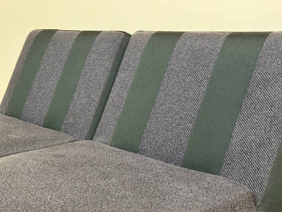 素材を切り替えてバイカラーに仕上げたバックレストの大ぶりなストライプ紋様は、バッククッションにより見え隠れすることで優美なコントラストを演出するマルセルソファを代表するカバーリング仕様。