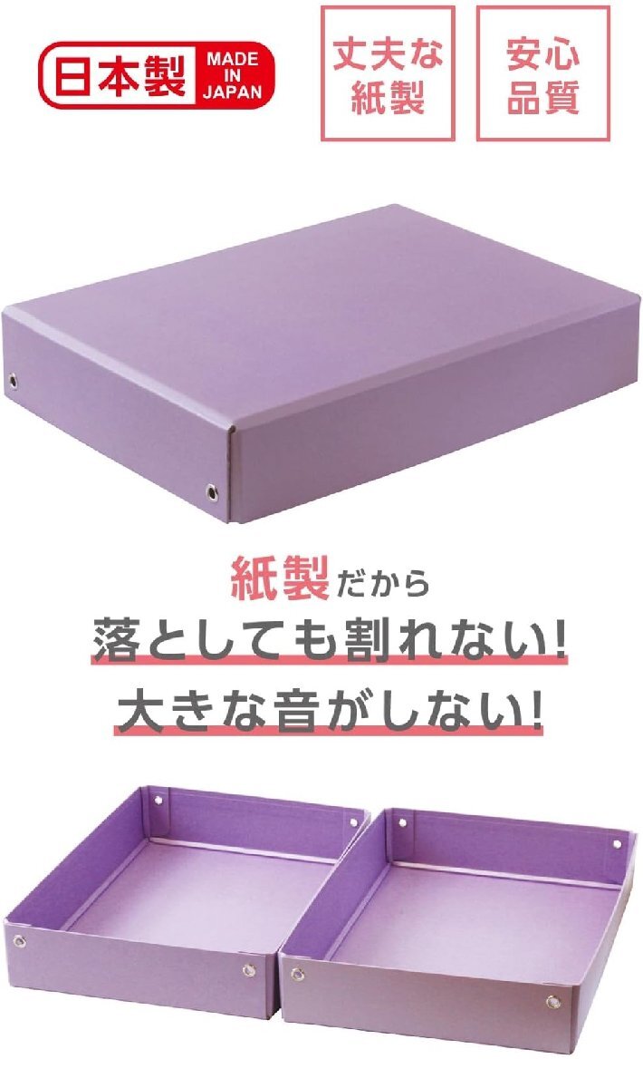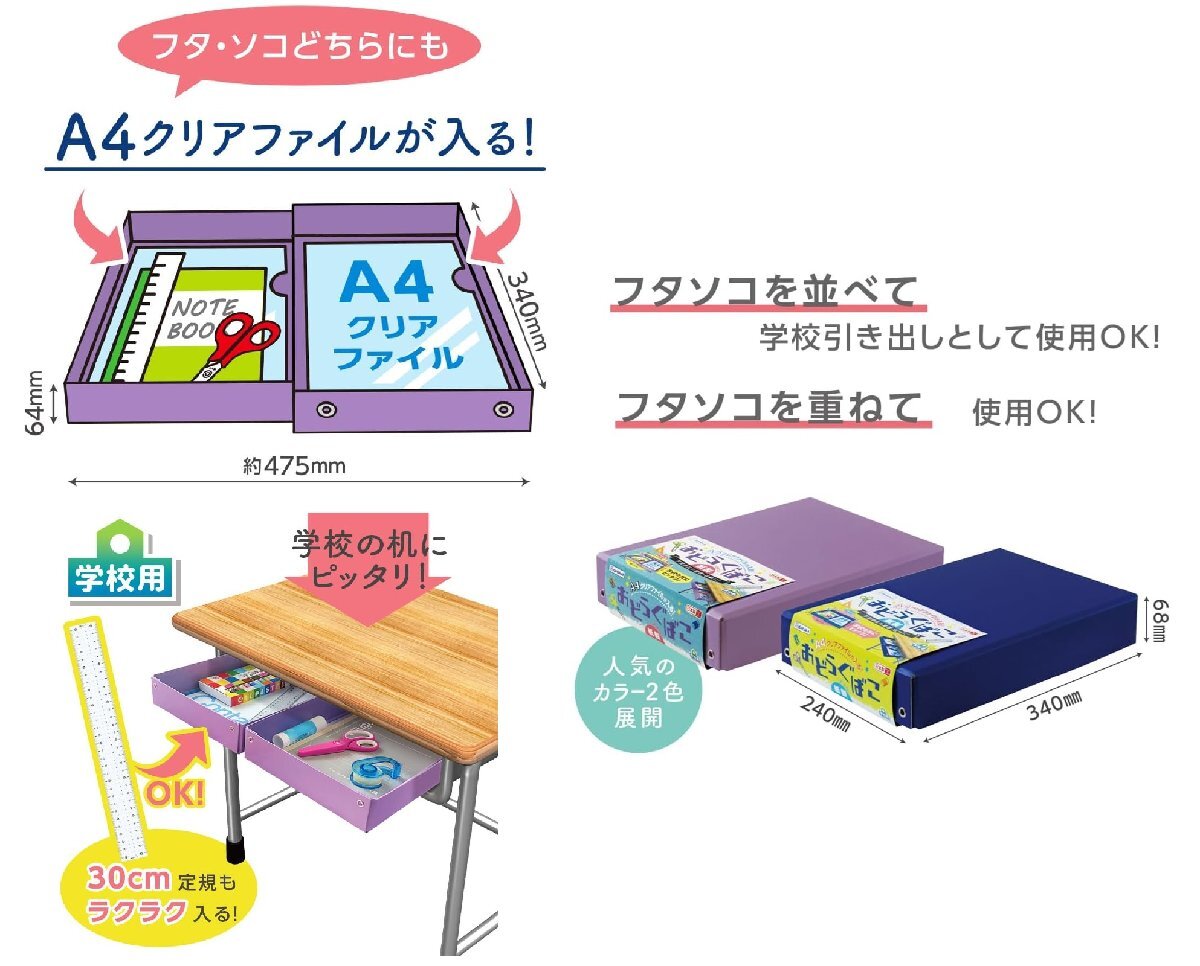 安心・品質のいい日本製の丈夫な紙製おどうぐばこです。箱本体と蓋を並べて学校引き出しとして使用できます。 【特徴】フタ・ソコどちらにもA4クリアファイルが入る! 【特徴】A4クリアファイルや30cm定規も入る! |