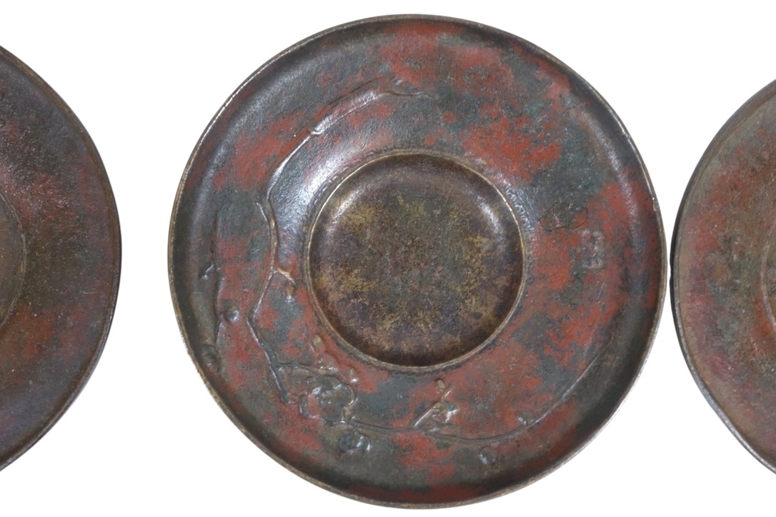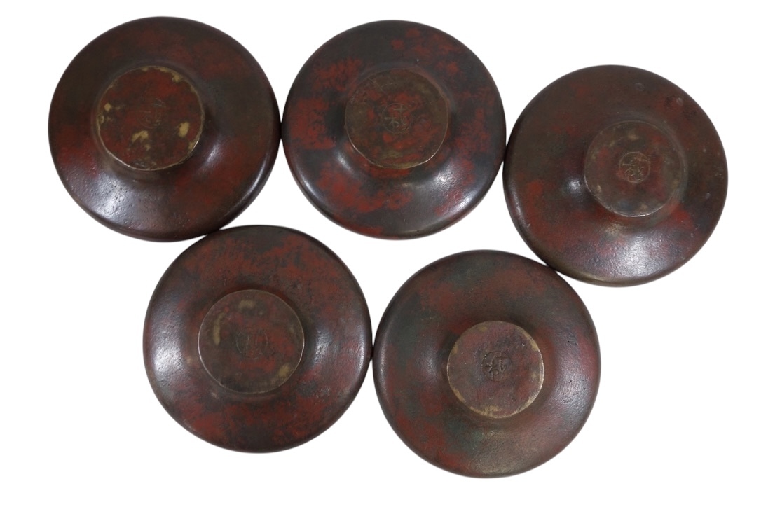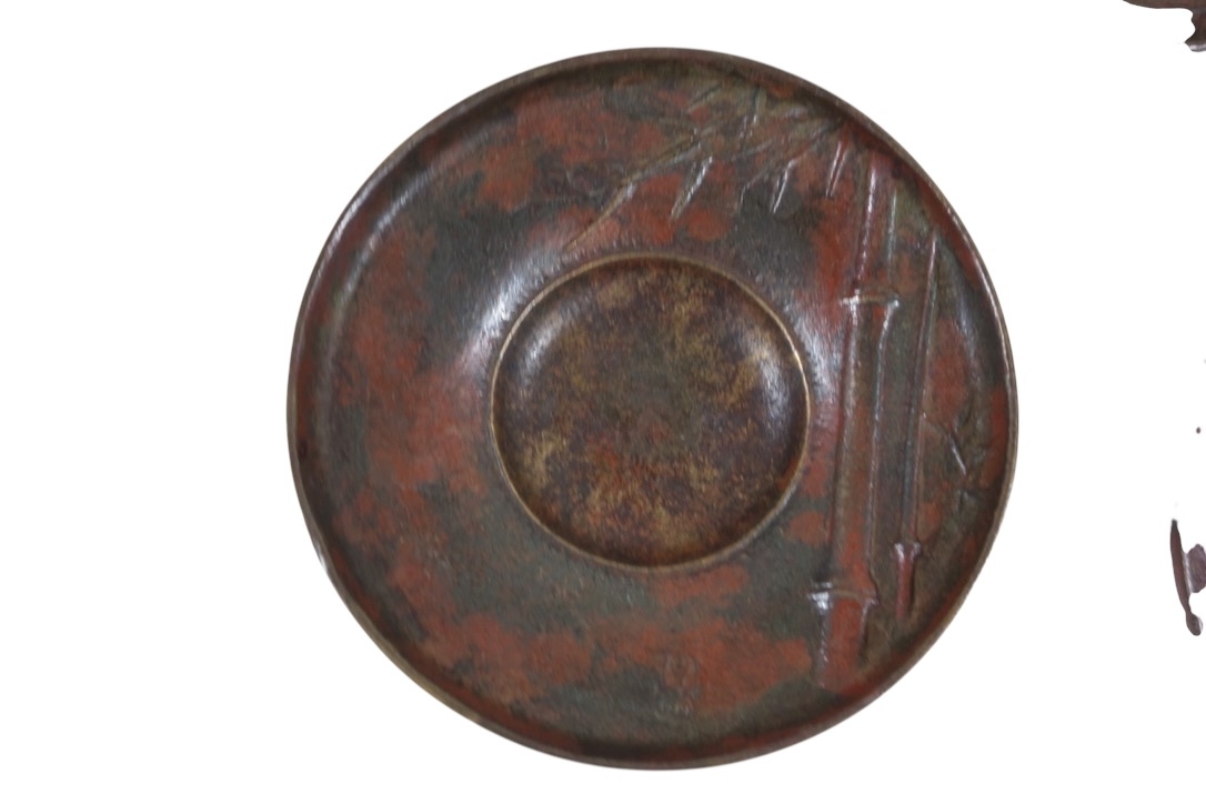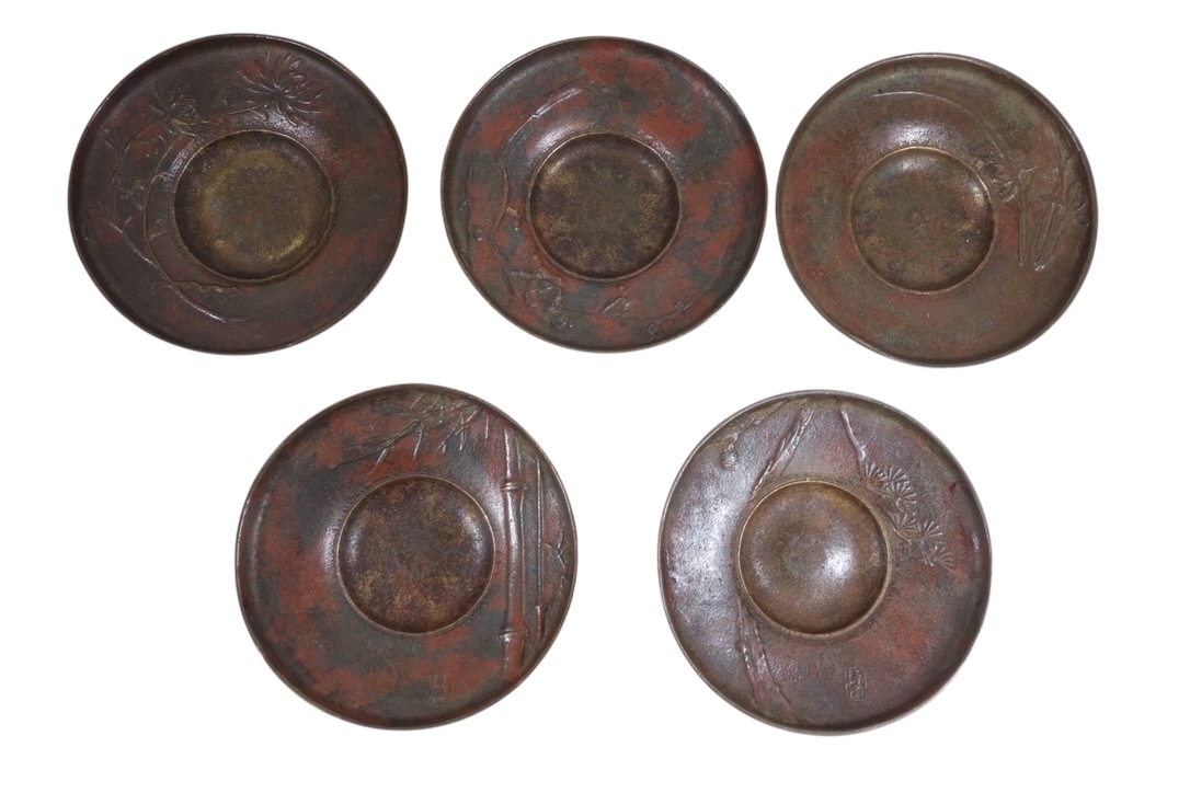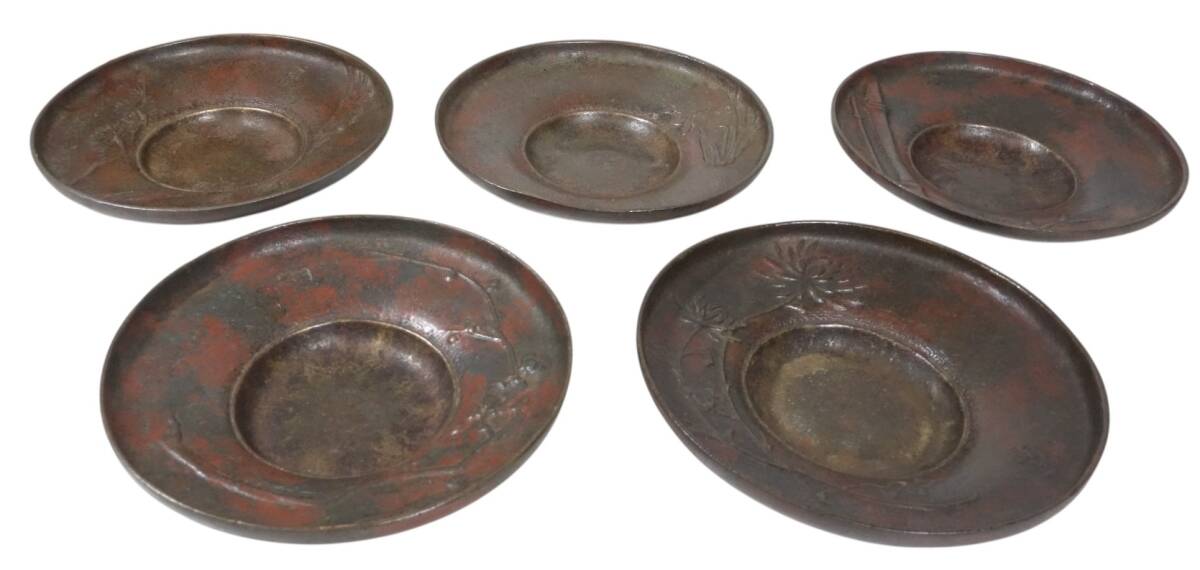 新潟県佐渡の著名な鋳金家! 昭和期 佐渡名工 本間琢斎 斑紫銅 銘「琢斎」図変わり 茶托 5客揃 煎茶道具 金工 GHK711