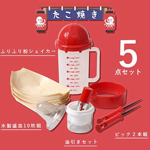 ・製品サイズ:(約)ふっ素加工用たこ焼き針/全長17.5×幅2×高さ2cm、木製たこ焼き盛皿/幅22×奥行11.5×高さ4.5cm、油引きセット/外径7×高さ11.5cm、ふりふり粉シェイカー/フタ使用時/幅12.5×奥行10.5×高さ19cm、注ぎ口使用時/幅14.5×奥行10×高さ16cm