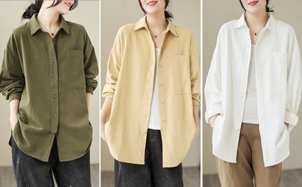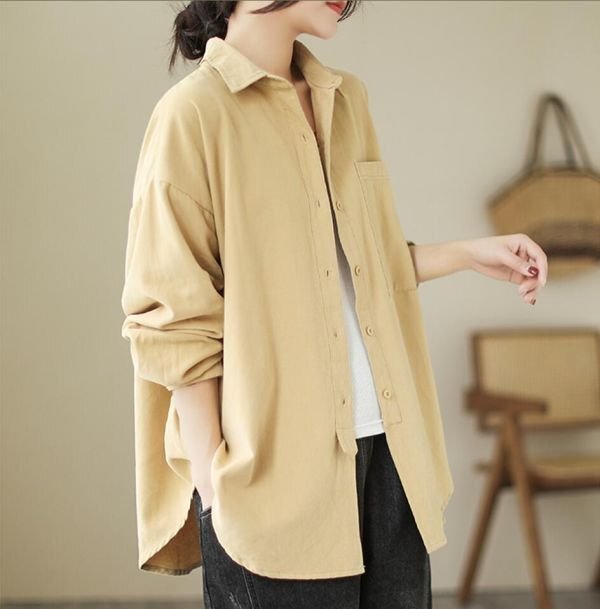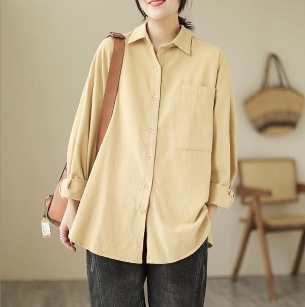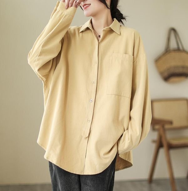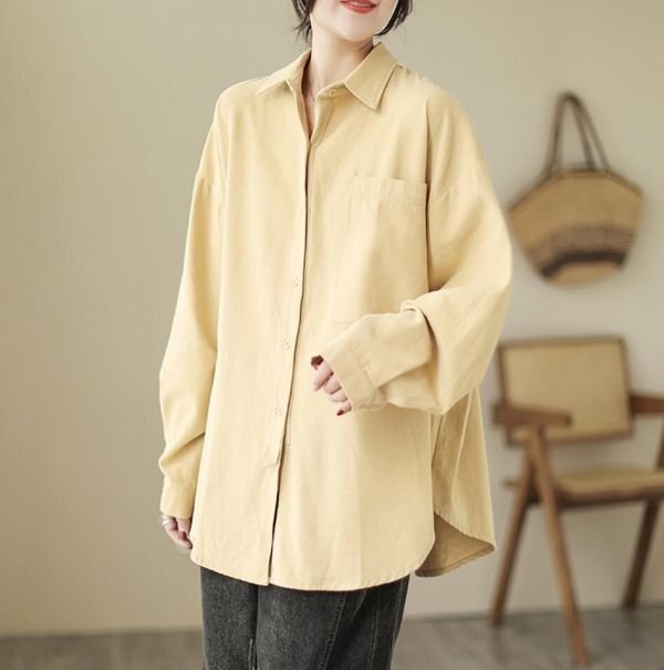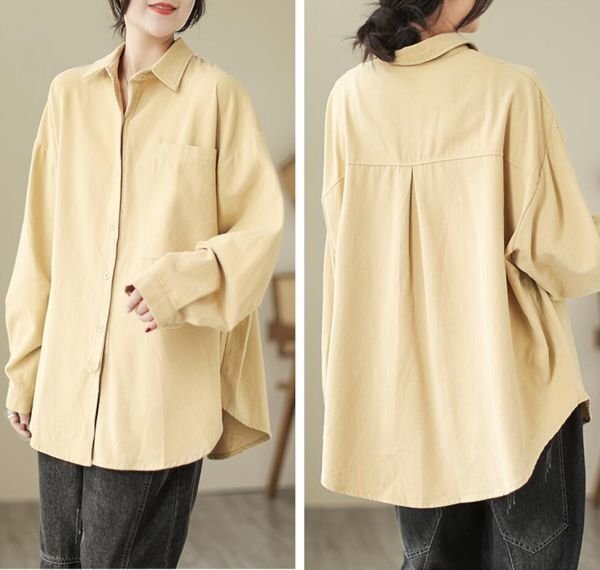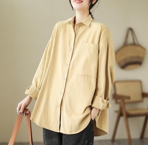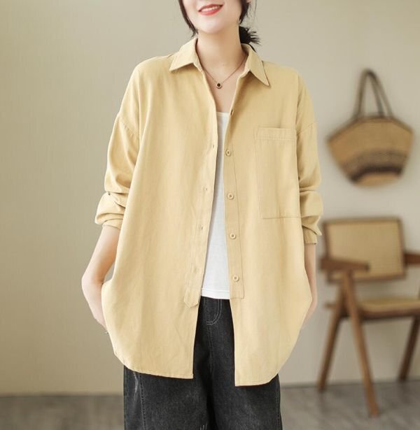 春新品 カジュアル コットン チュニック 素敵な無地 大きいサイズ 長袖 ブラウスシャツ トップス★カーキ/2XLサイズ