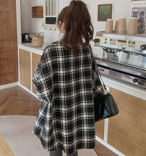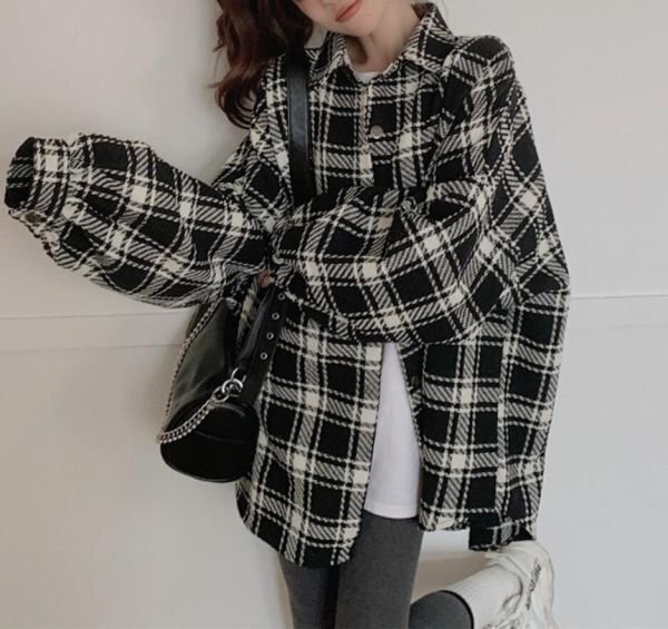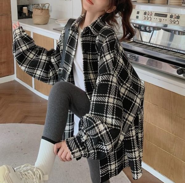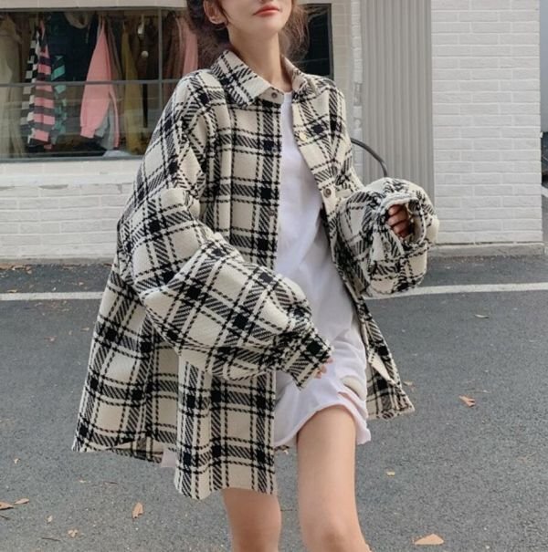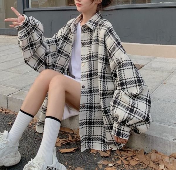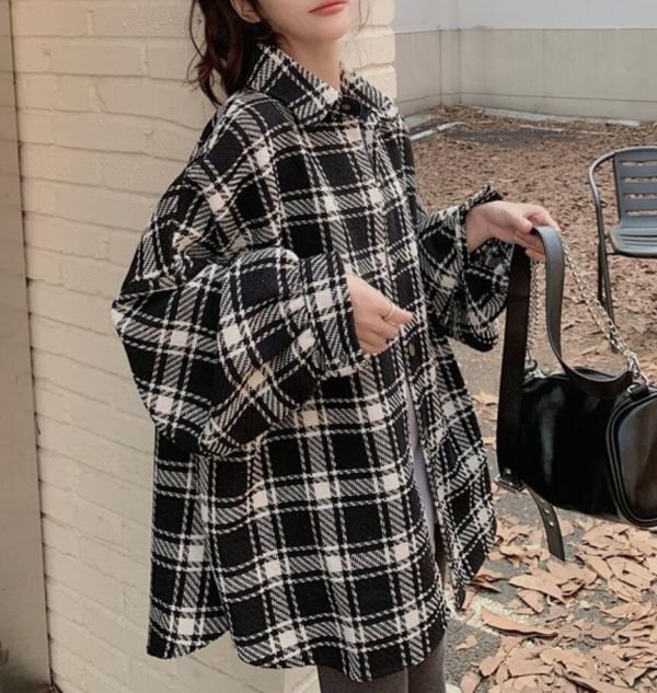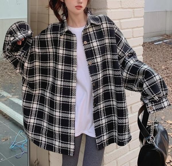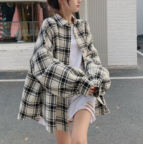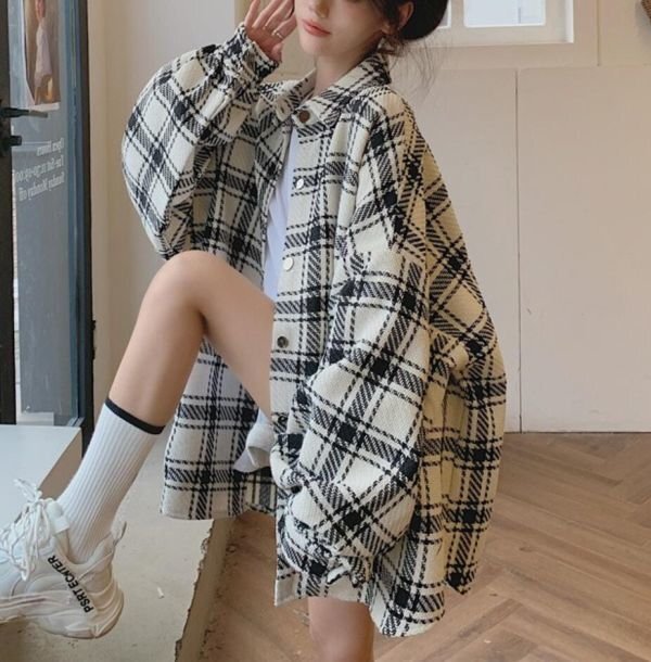 ロングシャツ シャツブラウス トップス チュニック 長袖 前開き チェック柄 カジュアル 大きいサイズ 着痩せ★白