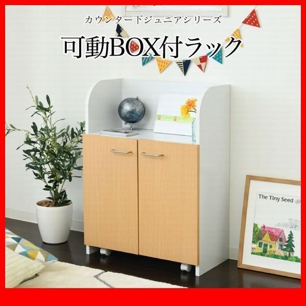| カウンター下に収納できる可動ボックス付きラックです。 扉内のキャスター付きボックスに遊んだおもちゃはお片付け♪扉内に収納すれば見た目もスッキリ。 可動棚収納付きなので、スケッチブックや文房具の収納にも最適です。 |