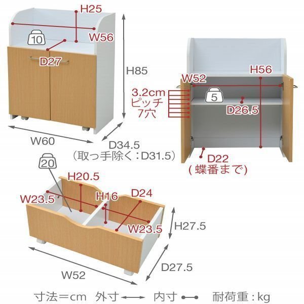 | 【カラー】 ホワイト×ナチュラル 【サイズ】 <外寸> 本体:幅60×奥行34.5×高さ85cm 可動BOX:幅52×奥行27.5×高さ27.5cm <内寸> 上オープン部:幅56×奥行27×高さ25cm 扉内:幅52×奥行22×高さ56cm 可動棚:幅56.5×奥行26.5×厚み1.5cm(3.2cmピッチ7段階) 可動BOX左右共通:幅23.5×奥行24×高さ16(有効20.5)cm 【材質】 天板・前板:合成樹脂化粧合板(PVC) 本体:プリント紙化粧合板 【耐荷重】 天板:10kg以下 可動棚:5kg以下 可動BOX:20kg以下 【生産国】 中国 【梱包】 サイズ:96×34×18.5cm、重量:17.6kg 【その他】 ・背面化粧有り ・キャスター4個 ・可動棚:1枚 【組み立て品】 お客様による組み立てが必要です。 【ご注意】 ・サイズ、重量は概算です。 ・商品カラーはご使用のモニターによって実際の明るさや色と異なって見える場合がございます。 |