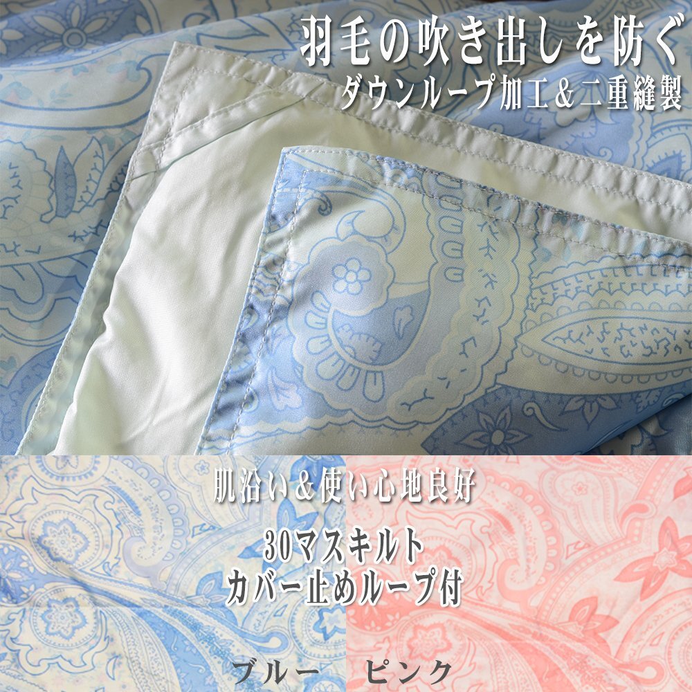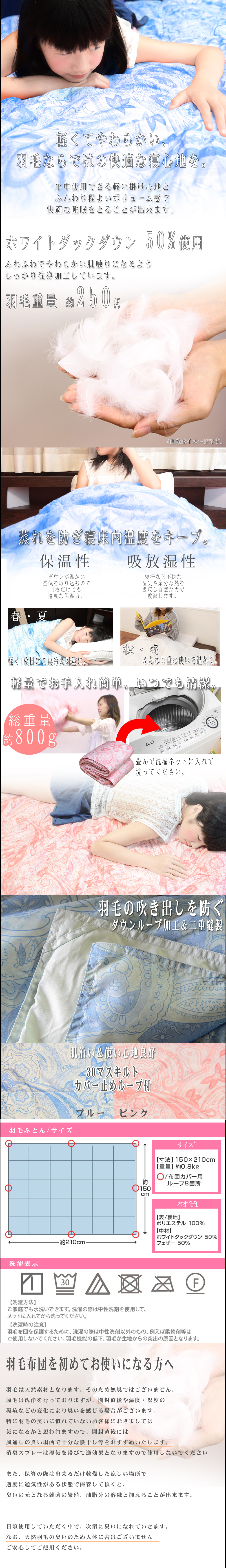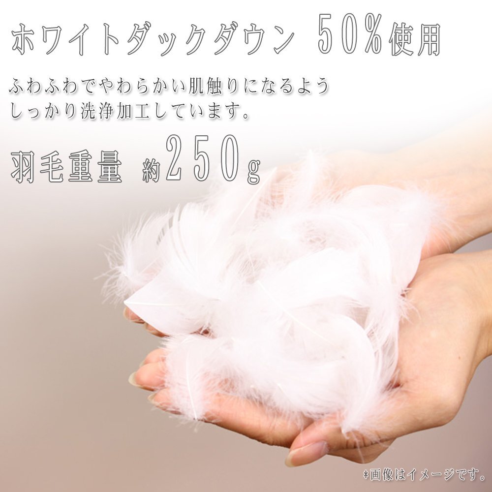 ホワイトダックダウン&フェザーを使用したやわらかな仕上がり! オールシーズンで使用でき、暑い時期は一枚で寝冷え対策に! 吸湿、放湿性に優れたダウンが寝具内を蒸れにくく、ほどよく保温! ご家庭でのお洗濯OK! 軽い掛け心地とふんわり程よいボリューム感で快適な睡眠を♪ 【商品使用】 カラー:ブルー(blue 青) サイズ:(約)150×210cm(シングルサイズ) ※充填量:約0.25kg 重量 :(約)800g 素材 :・側生地:ポリエステル 100% その他:・30マスキルト加工 |