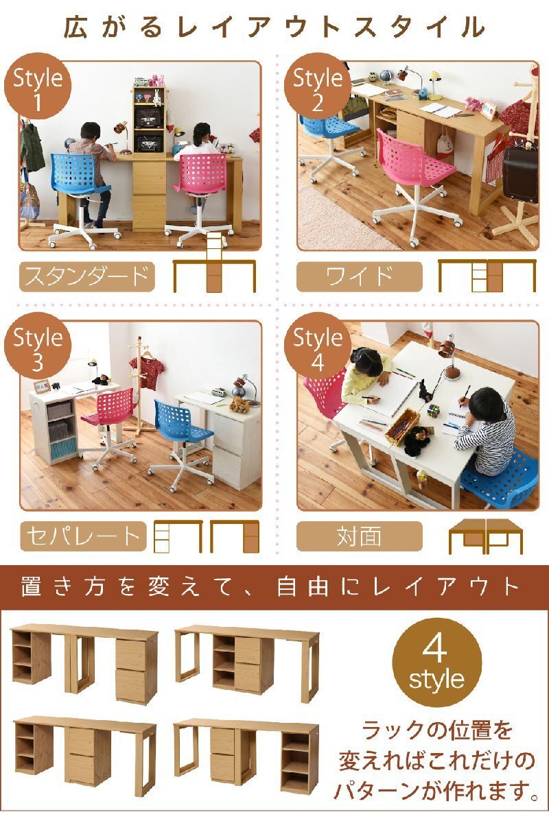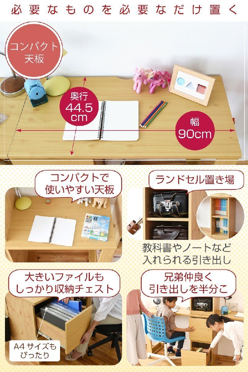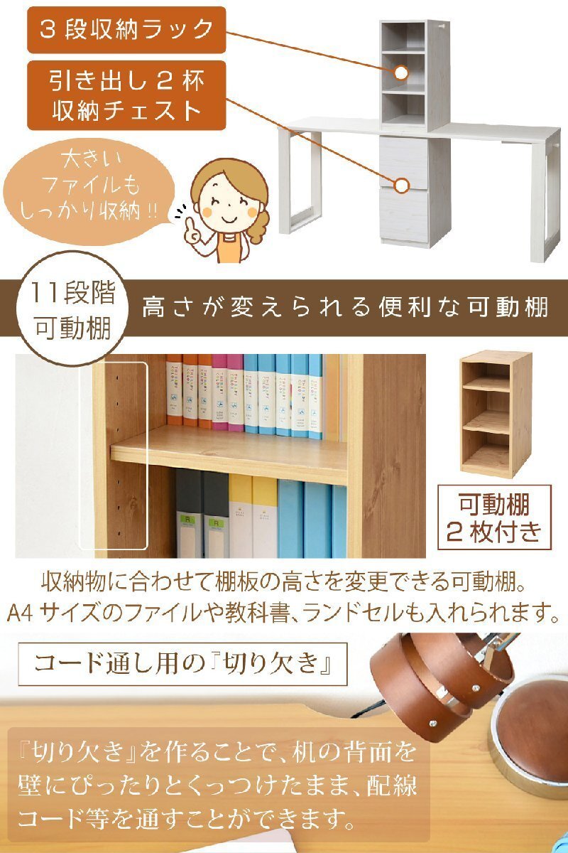 | ■商品説明 木目調が優しい印象を与えるホワイトとナチュラルの2カラー。ラックとチェストがついている省スペースなデスク。積み重ねても横に並べてもいいので自由に使えます。A4ファルや教科書が入る便利な設計。 |