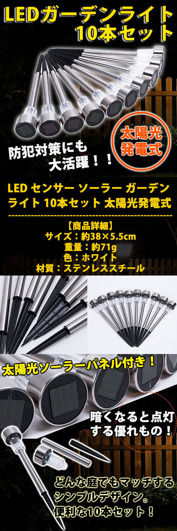 LED センサー ガーデンライト 10 本 セット 太陽光 屋外 防水 ソーラー 充電 式 庭園灯 自動点灯 白 ホワイト シンプル メタル シルバー