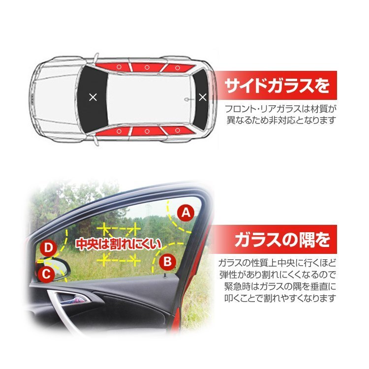 ・ガラスの性質上中央に行くほど弾性があり割れにくくなるので、緊急時はガラスの隅を垂直に叩くことで割れやすくなります