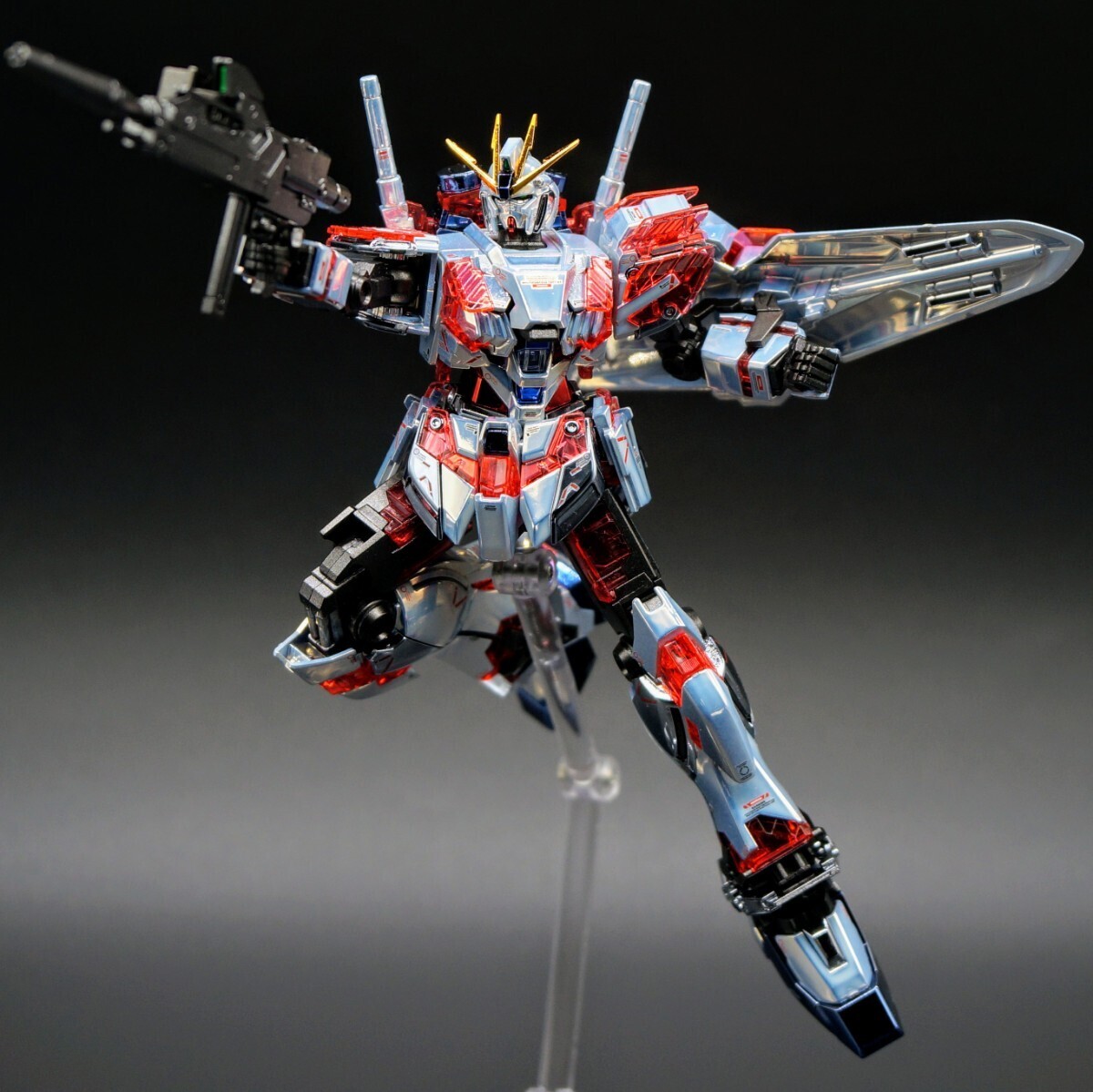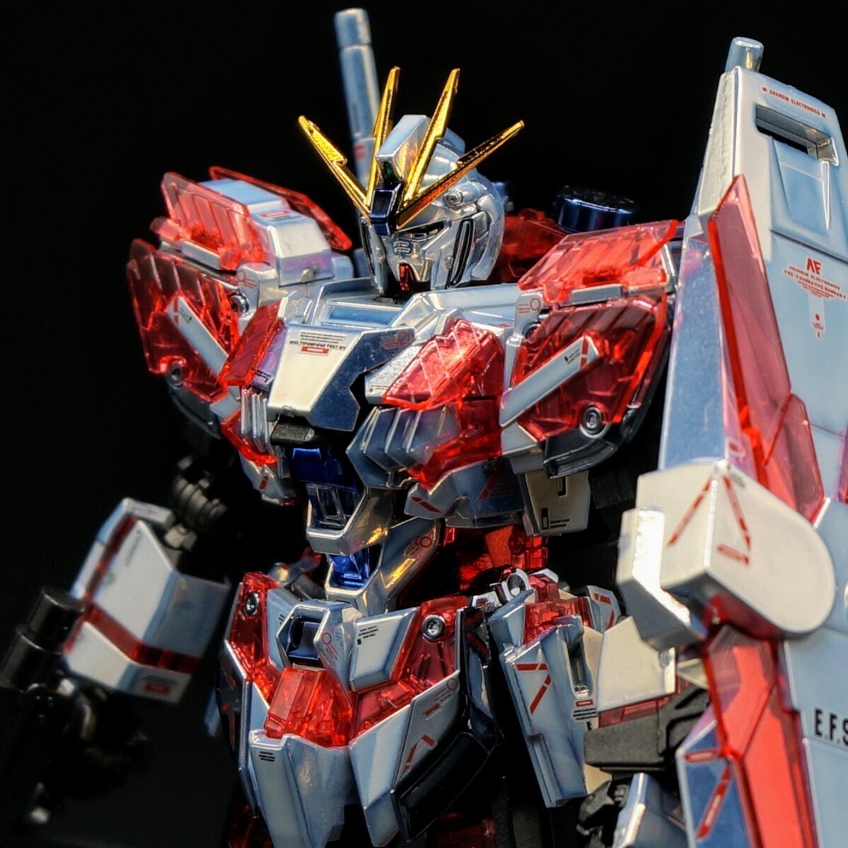 HG ナラティブガンダムのキットのランナーに合わせたカラーでメッキ加工を施し、制作した完成品での出品です。主に外装部分にメッキ加工を行い、内部フレームはメタリック系塗料で塗装しています。