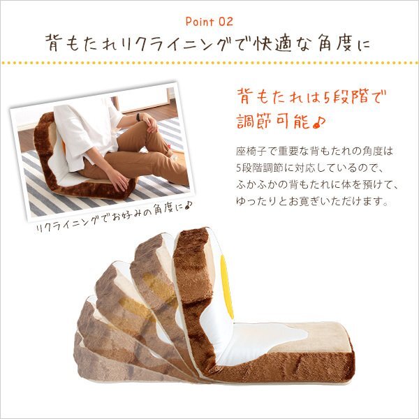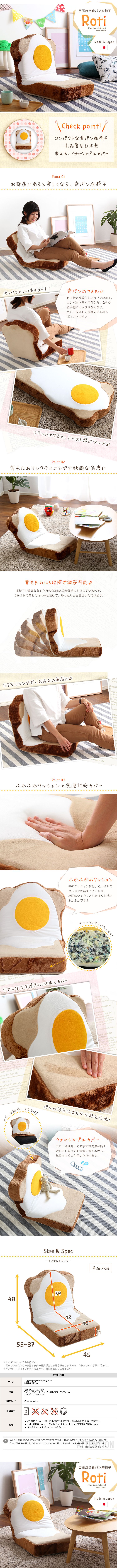 | 【ポイント】 安心の日本製、目玉焼き食パン座椅子です。 愛らしいコンパクトサイズだから女性やお子様にピッタリです。 5段階リクライニングで背もたれを快適な角度に調整可能です。 ウレタンがたっぷり詰まったふかふかクッションです。 取り外して洗える、ウォッシャブルカバーです。 |