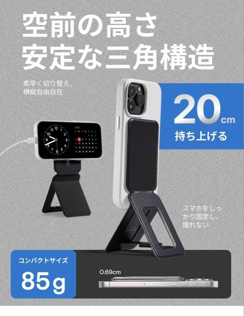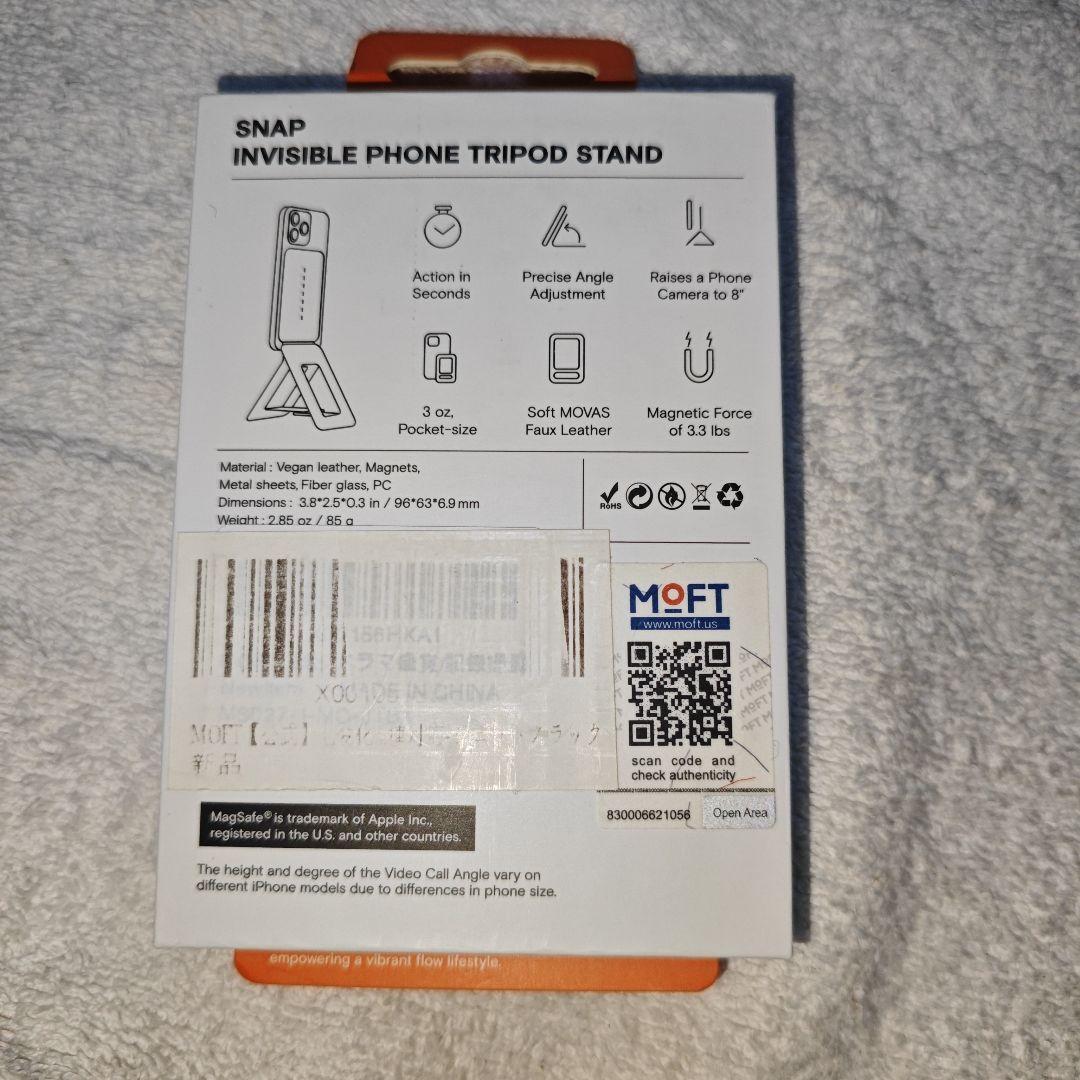 「これがあれば動画撮影がプロ並みになる!」と彼女が手に入れたMOFT公式の「七変化マルチスタンド」、王道のジェットブラックです。 …どうやら「いつでもどこでも立てられる」という安心感だけで満足したのか、未使用のままコレクション入り。 スマホでの撮影やビデオ通話が多い方に、ぜひ! ●商品:MOFT 七変化マルチスタンド - MagSafe対応 ・MOFT Japan正規品、カード収納なしの純粋なスタンドモデルです。 ・色は高級感あふれる定番の「ジェットブラック(漆黒)」。 ・高耐久ヴィーガンレザー「MOVAS」素材。マットな質感が魅力です。 ・MagSafeでiPhoneに強力吸着。 ・特許取得の一体式折り畳み構造で、最大約20cmの高さまでスマホを設置可能!三脚として動画撮影やビデオ会議、ライブ配信で大活躍します。 ・多角度に調整可能で、目線の高さで使えるため姿勢改善にも。 ・折り畳めば厚さ約0.74cmのカードサイズで超薄型。 ・新品未使用です。 ●状態:新品未使用。 ●カラー:ジェットブラック(漆黒、写真参照) ●素材:MOVASヴィーガンレザー、グラスファイバー、マグネット等 ●対応機種:iPhone 12~16全シリーズ(MagSafe対応)。MagSafeケース等で他機種も使用可能です。 実物の写真は5枚目以降になります。説明と異なる場合がありますので、必ず写真をご確認ください。不明点はコメントくださいませ。 訳あり品のため、箱潰れ・ビニール破れ・開封痕・指紋などがある場合がございます。簡易検品のため、使用感や部品不足を見落としている可能性もあります。 完品をお求めの方はご希望に添えない場合がございます。 Amazon参考価格:5780円 即日発送(最安発送方法に変更あり) フォロー+購入希望コメントで100円お値引き ご購入前にプロフィールをご確認ください。 管理番号3 |