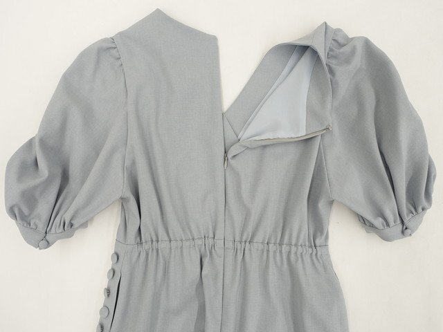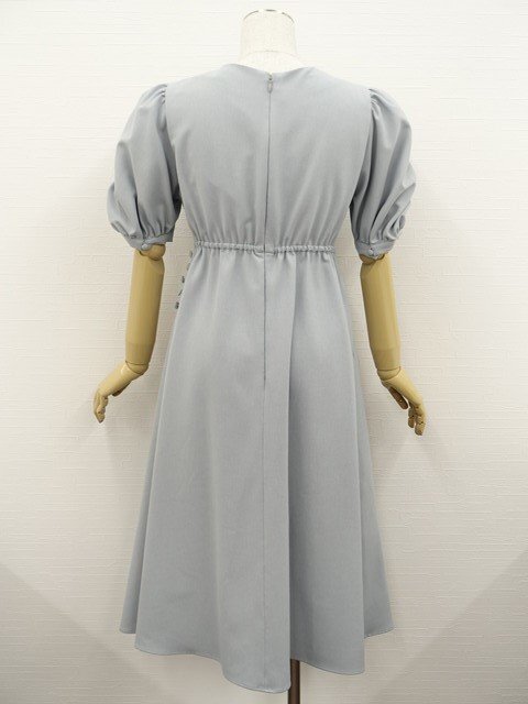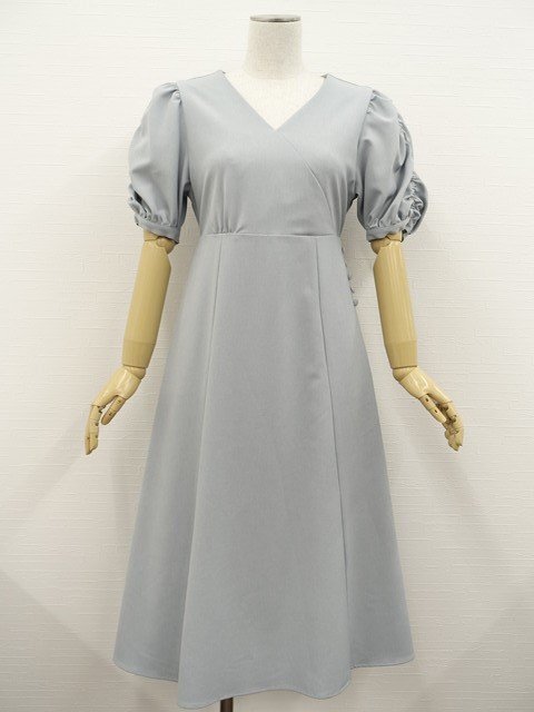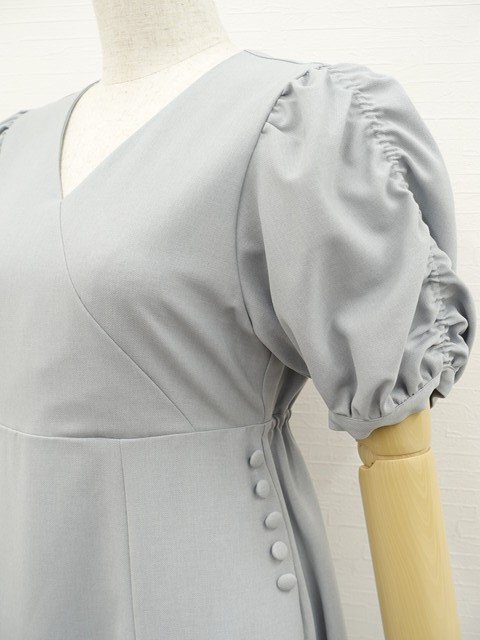 洗えるロング丈 パフスリーブ 半袖 Vネック ワンピース フォーマル F ダスティブルー