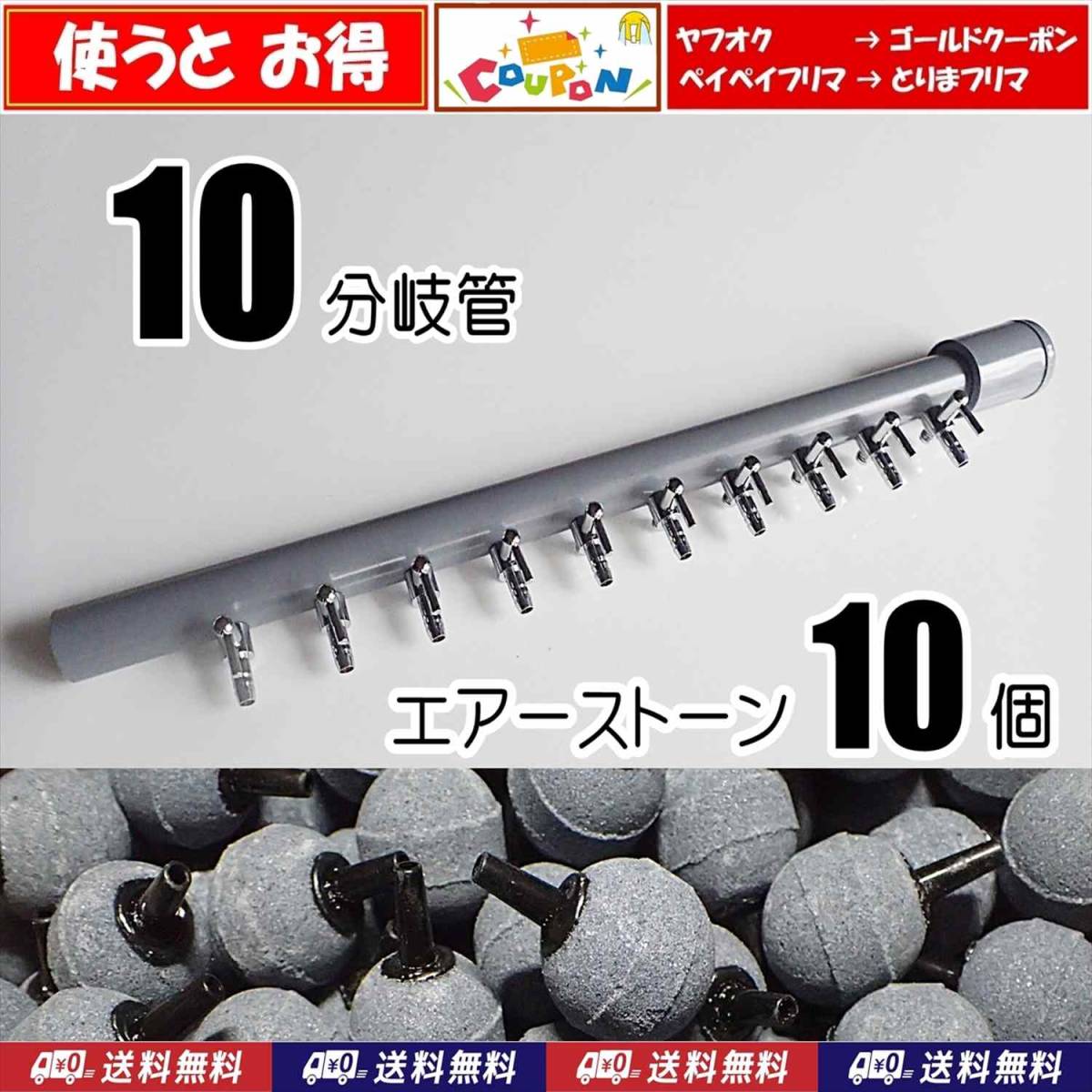 【送料込】ブロワ接続用 エアーコック 10分岐管+エアーストーン10個   一方コック10連1列 シュリンプ・金魚・メダカ水槽のエアー分岐に