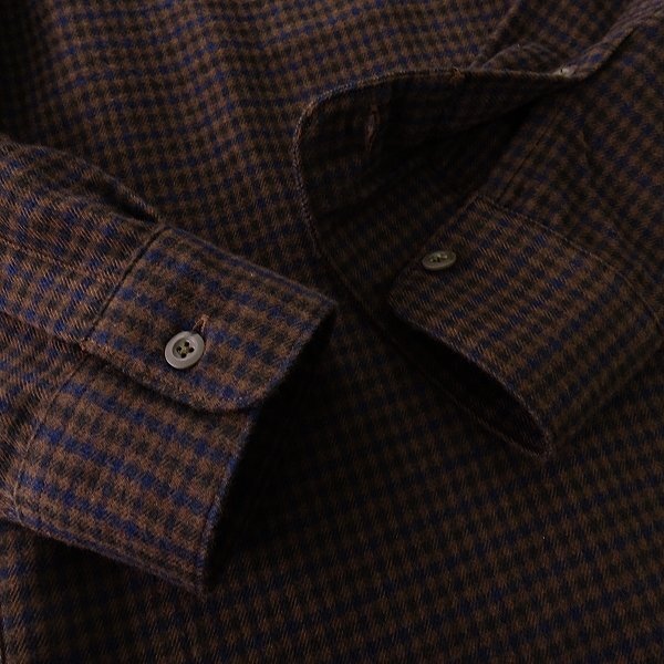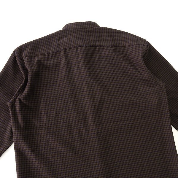 温かみがあり、柔らかくソフトな風合いのフランネル素材を使用したシャツです。 厚手すぎず、薄すぎず程よい生地感で、秋~春先のロングシーズンでの着用が可能です。 首元はすっきりとした印象のバンドカラーデザインで、ガンクラブチェックが上品な印象です。 |
