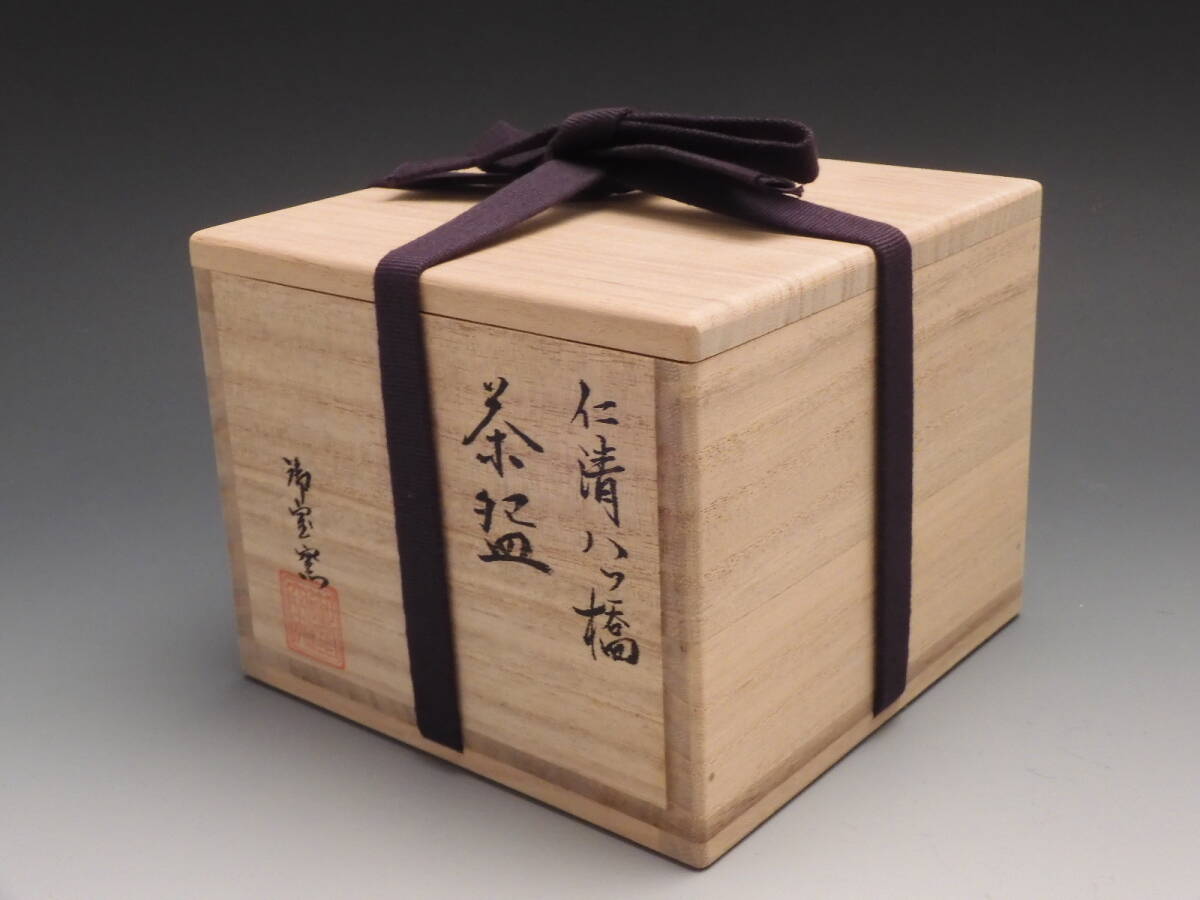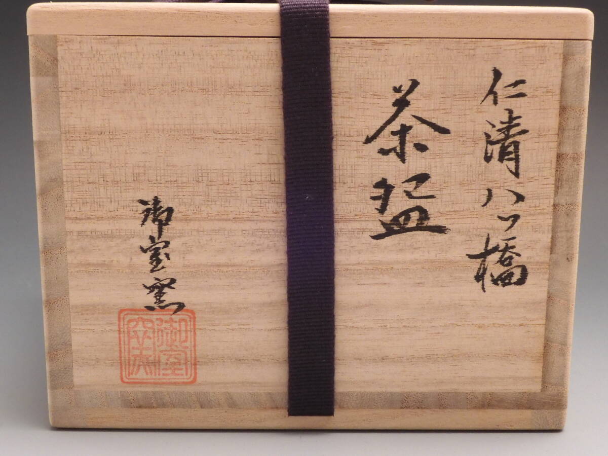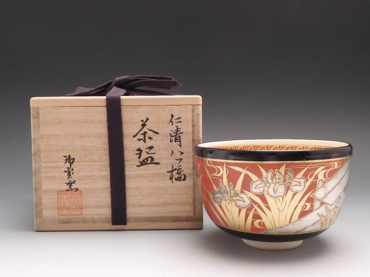 | ◇桔◇御室窯 金彩色絵 仁清八ツ橋文 茶碗 茶道具 共布 共箱 無傷 未使用 E11◇ |