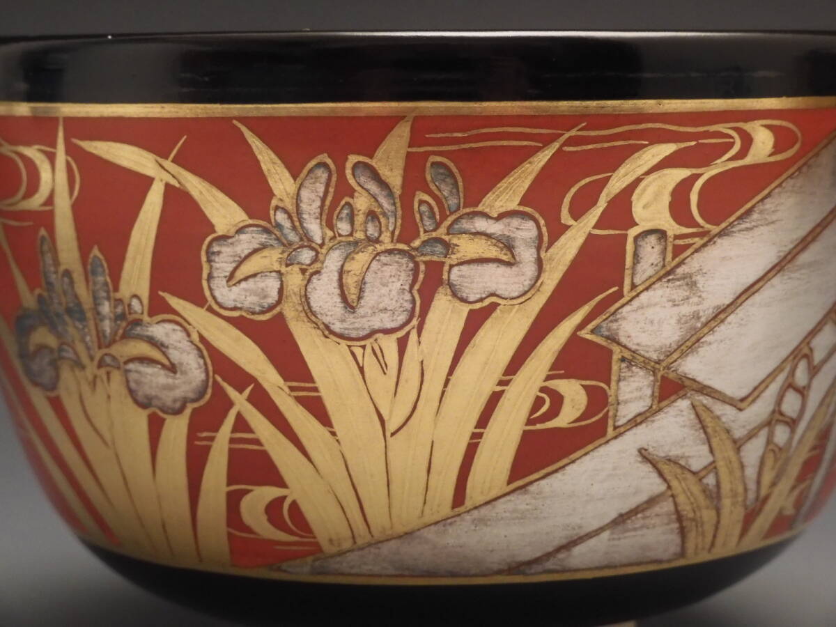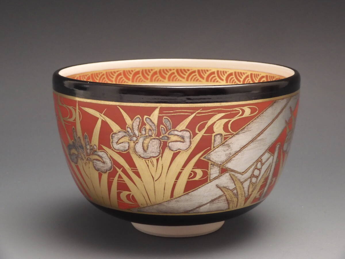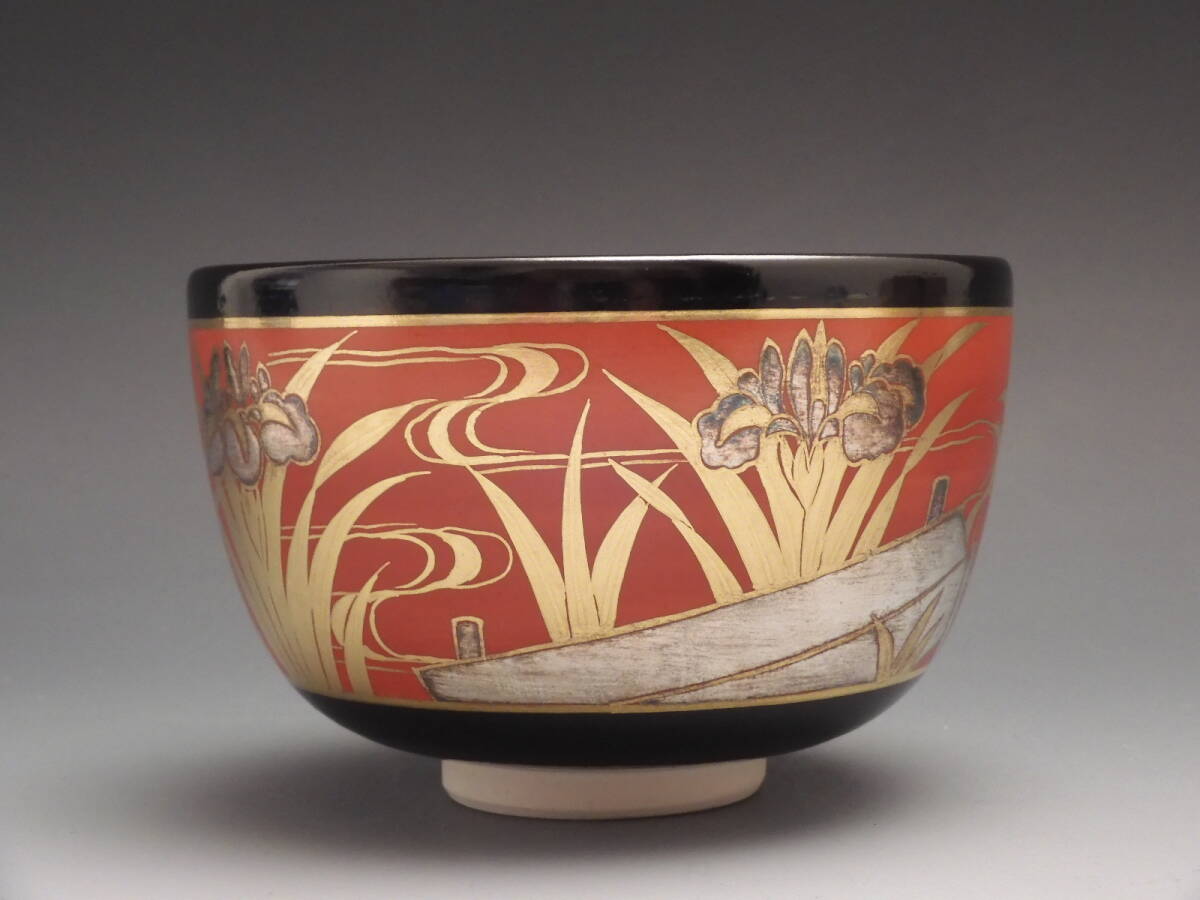 | ◇桔◇御室窯 金彩色絵 仁清八ツ橋文 茶碗 茶道具 共布 共箱 無傷 未使用 E11◇ |