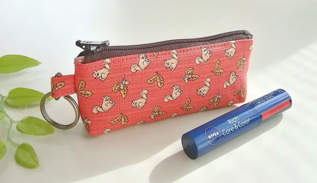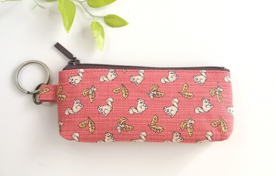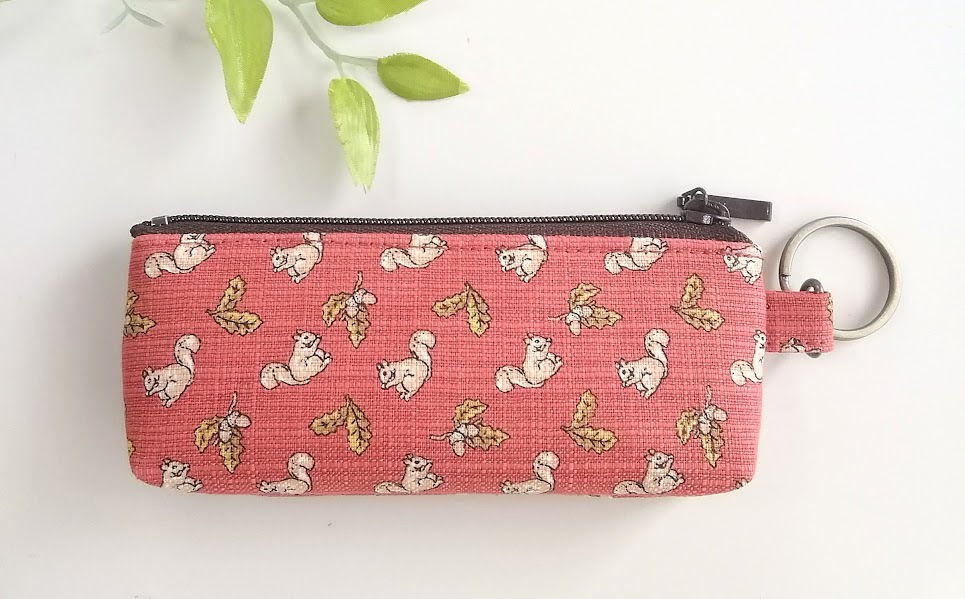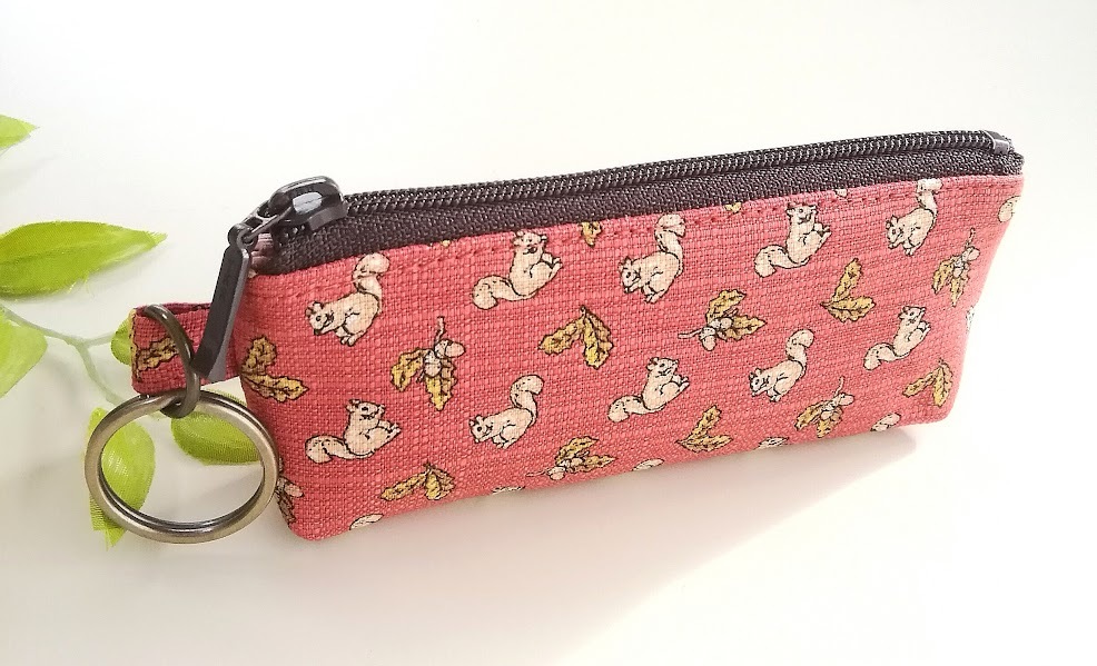ハンドメイド〈キーリング付き〉 横長ミニポーチ  大人可愛い*リス柄 (12×4.5×2弱)※リップケ-ス/コインケースに