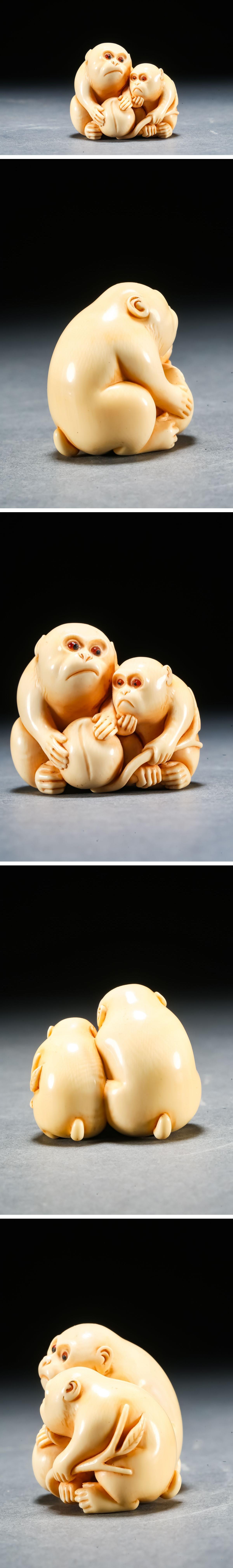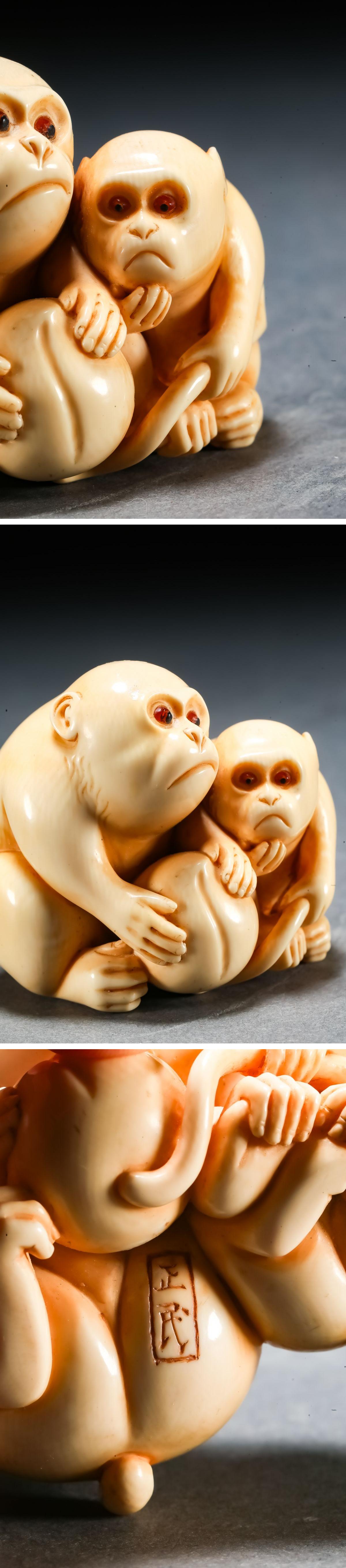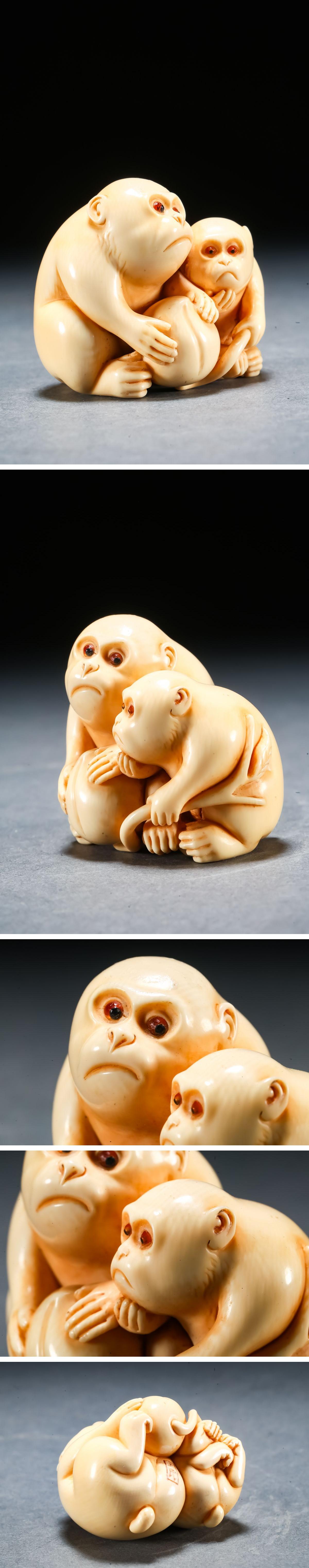 【雲錦】某有名オークション買入 時代物 特殊白材 親子猿彫り物 在銘 骨董品 古美術Z-52