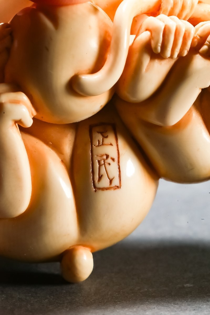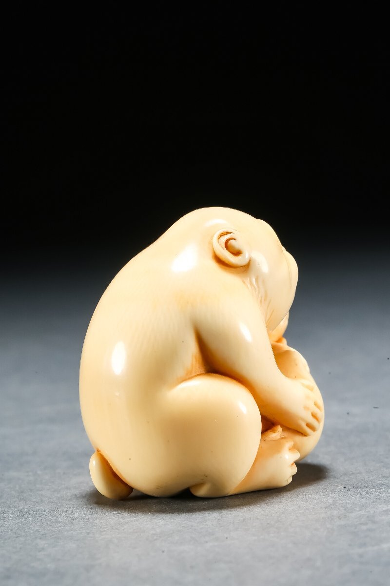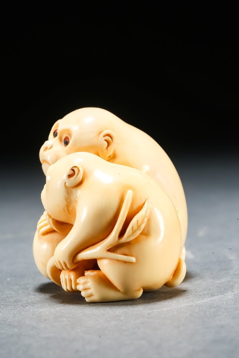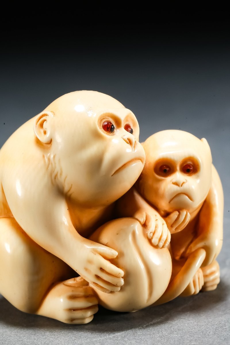 【雲錦】某有名オークション買入 時代物 特殊白材 親子猿彫り物 在銘 骨董品 古美術Z-52