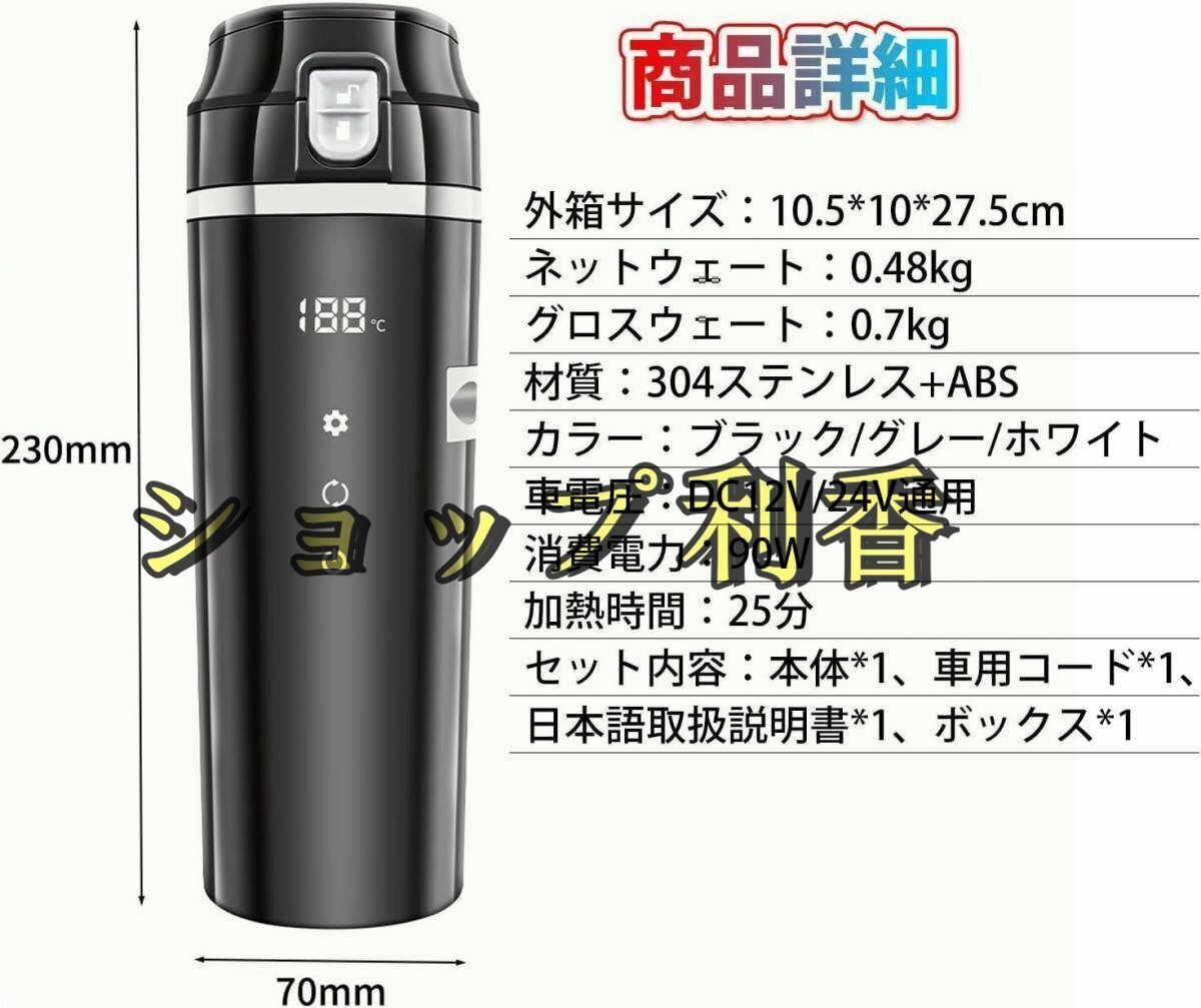 商品説明 商品説明 本体サイズ:7*7*23cm外箱サイズ:10.5*10*27.5cm ネットウェート:0.48kg グロスウェート:0.7kg 材質:304ステンレス+ABS カラー:ブラック/グレー/ホワイト 容量:500ml セット内容:本体*1、車用コード*1、日本語取扱説
