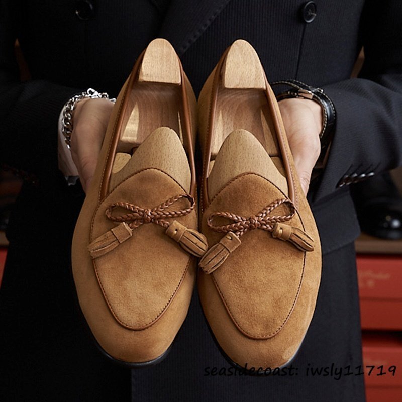 定価10万■最高級 ビジネスシューズ スエード革 職人手作り 本革 レザーシューズ タッセル ローファー 紳士靴 革靴 牛革 ブラウン 24.5cm