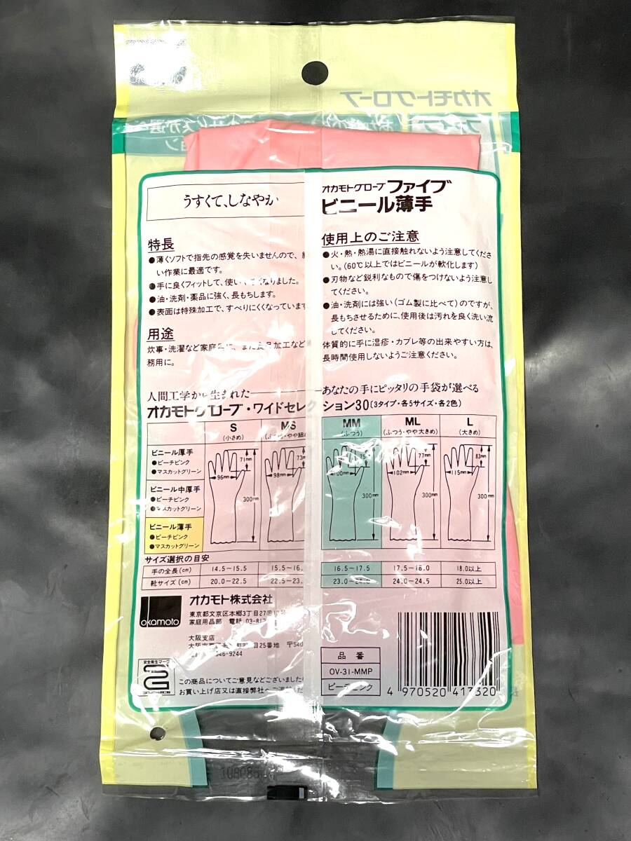 昭和レトロ 入手困難 オカモト ビニール手袋 ファイブ 薄手・うら毛なし サイズMM ピンク 日本製 日用品 雑貨 アンティーク 新品 ビンテージ