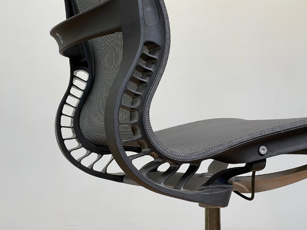 削り取られた煩雑な機能や操作性により実現した軽量さと共に、高機能デスクチェアとしては唯一無二、背もたれと座面を一体とした設計で、驚くほど快適な座り心地を実現しており、それを可能とした「キネマチックスパイン」というバネ状の構造体は、デザインによる優れた問題解決例として不動のリーディングケースとなっています。