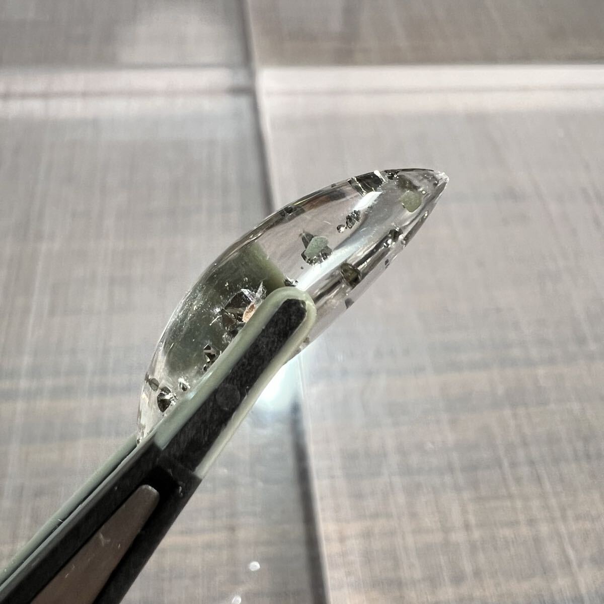 透明感が高く、角度を変えるとパイライトが光を反射し、実物は写真以上にギラギラと輝きます。