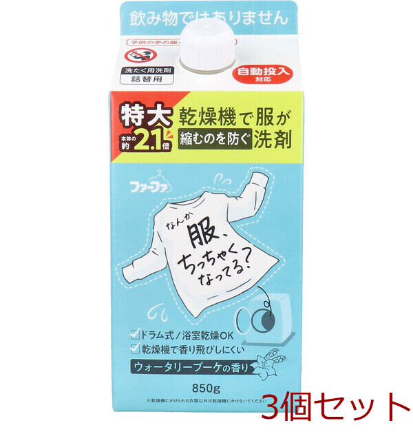 乾燥機を使うあなたのために開発しました。 なんか服、ちっちゃくなってる?乾燥機で服が縮むのを防ぐ洗剤。 清潔感はお洋服の「見た目」と「香り」から。 ・乾燥機による、縮み・毛羽立ち・色あせを防ぐ。 (乾燥機にかけられる衣類に限る。) 繊維トリートメント成分配合処方。 ・熱で香り飛びしにくい。 涼やかで瑞々しいウォータリーブーケの香り。 ・生乾き臭防止。 消臭&抗菌。 ※すべての菌に効果があるわけではありません。 自動投入対応。 ドラム式・浴室乾燥機OK。 ・すすぎ1回。 ・蛍光剤・漂白剤無配合。 ・衣料用液体洗剤 超コンパクトタイプ。 詰替用。 ・便利でエコ! 「コンパクトecoパック」 【ボトルへの詰替方】 (1)キャップを左に回して、取りはずしてください。 (2)中栓の取っ手をしっかりと指でつまみ、中栓に書かれている矢印の方向に引き抜いてください。 中栓を抜く際、液はねにご注意ください。 (3)本体ボトルに注ぎ口を軽くのせてゆっくり注ぎ入れてください。 注ぎ始めに詰め替え容器を強く持ちますと液が飛び出すことがありますのでご注意ください。 詰め替え容器の底の部分を台などの上に置くと、詰め替えやすくなります。 ※爪を引っかけてあけますと爪をケガする場合がありますのでご注意ください。 ※開栓は安定した台の上で容器をしっかりささえて行ってください。 ※詰め換え後は確実にキャップを閉めて、立てて保管してください。 ※詰替えて使う時は必ず「ファーファ なんか服、ちっちゃくなってる?乾燥で服が縮むのを防ぐ洗剤 400g」のボトルに詰め替えてください。 他のボトルに詰め替えると、香りが移ったり液が固まることがあります。 個装サイズ:85X190X85mm 個装重量:約900g 内容量:850g 製造国:日本 【発売元:NSファーファ・ジャパン株式会社】 【品名】 洗濯用合成洗剤 【用途】 綿・麻・合成繊維用 【液性】 中性 【成分】 界面活性剤(15% ポリオキシエチレンアルキルエーテル、ポリオキシアルキレンアルキルアミン)、香料、抗菌剤、酵素、繊維潤滑成分 【使用量の目安】 ★ドラム式(洗たく物量)/タテ型(水量):使用量の目安 6.0kg/65L:55g 5.0kg/55L:50g 4.0kg/45L:38g 2.0kg/30L:25g ・手洗いの場合は、洗剤10gを水4Lに溶かして使う。 ・洗剤は上記使用量の目安を参考に計量してください。 ・節水には「ためすすぎ」を選択。 ・柔軟剤・衣料用漂白剤(酸素系)も使えます。 ・特に落ちにくい汚れには原液を少量、直接塗布してからお洗たくすると、より効果的です。 ・ドラム式にも対応した低泡性処方です。 ★お洗たく前に必ず確認。 ・衣類の取扱い表示を確認する。 ・色落ちが心配な衣類は、原液を衣類の目立たない部分につけて5分ほどおき、変色、色落ちするものは洗わない。 ・「家庭での洗濯禁止」の表示がある衣類には使わない。 【応急処置】 ・目に入った時は、こすらずすぐに流水で充分に洗い流す。 ・飲み込んだ時は、吐かずに口をすすぎ、水を飲む等の処置をする。 ・異常がある時は、商品を持参し医師に相談する。 【使用上の注意】 ・子供の手の届く所に置かない。 ・認知症の方等の誤飲を防ぐため、置き場所に注意する。 ・用途外に使わない。 ・荒れ性の方や長時間使用する場合、また原液で使う場合は炊事用手袋を使う。 ・使用後は手を水でよく洗い、クリーム等でお手入れをする。 ・洗たく機のフタ等のプラスチック部分に洗剤がついたまま放置すると傷むことがあるので、水ですぐにふきとる。 ・高温や低温、直射日光等を避けて保管する。 ・やわらかい材質のため、持ち運びや保管時の破損に注意する。 ・これは飲み物ではありません。 注意事項 ※予告なく成分・パッケージが変更になることがございます。 予めご了承ください。 *予告なく成分・パッケージが変更になることがございます。予めご了承ください *ダンボールを使用して発送する場合には、入数以下の個数の場合、 中古ダンボールを使用する場合があり、ご注文の商品とは異なるダンボールになる場合があります。 あらかじめ、ご了承ください。 |