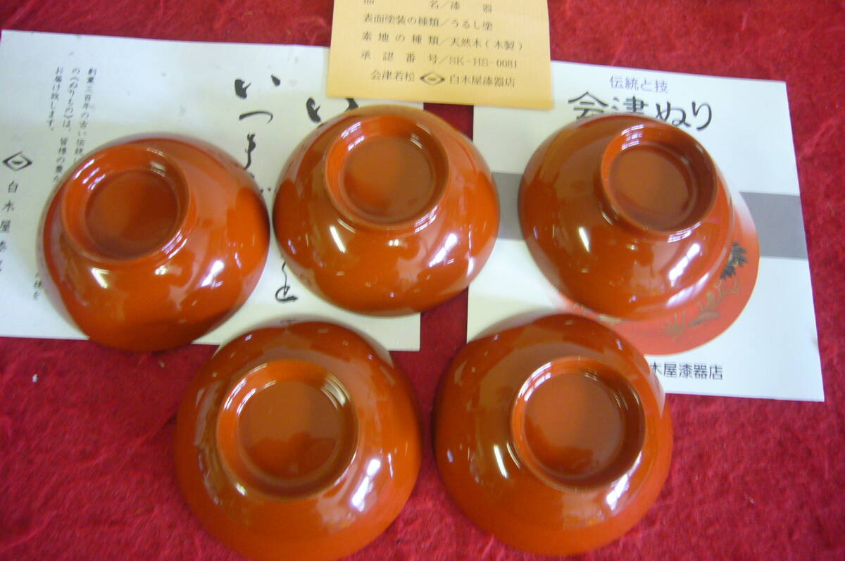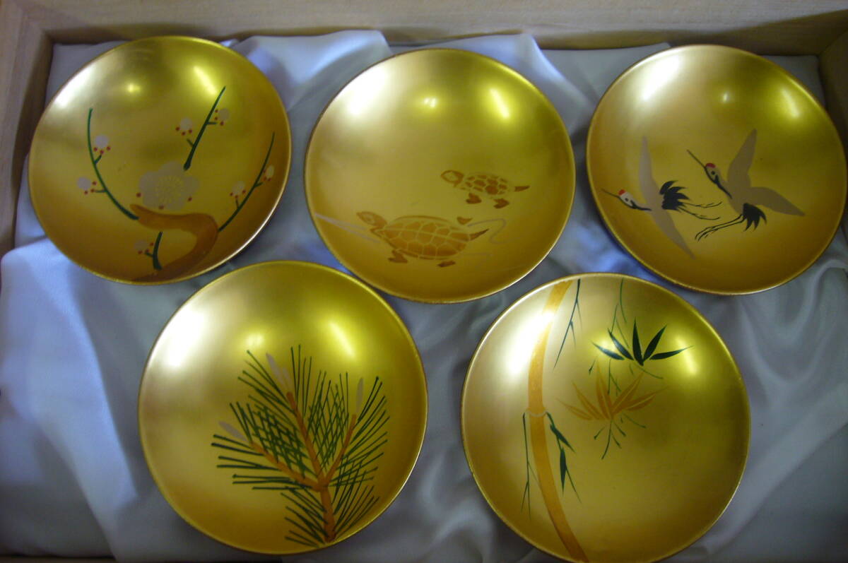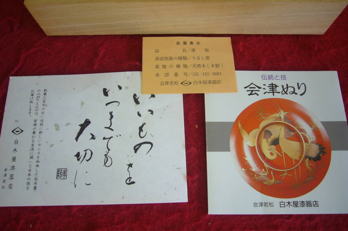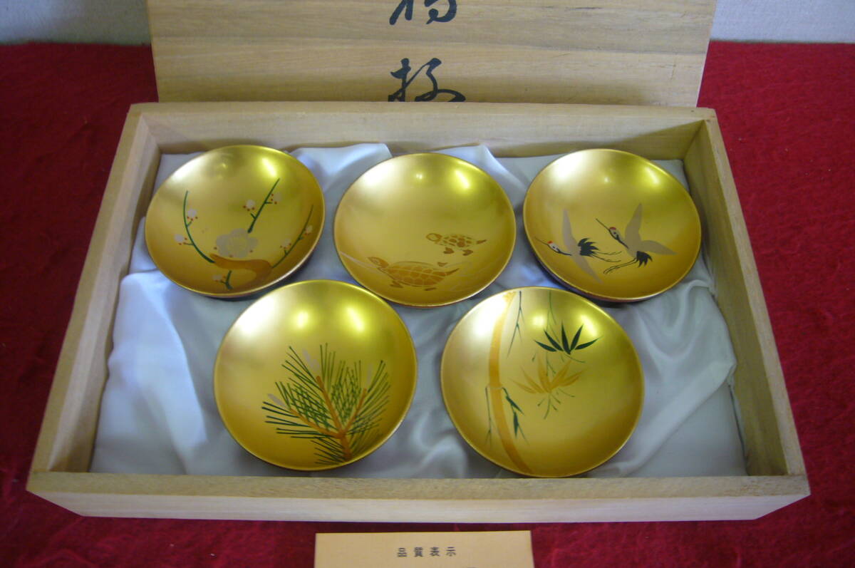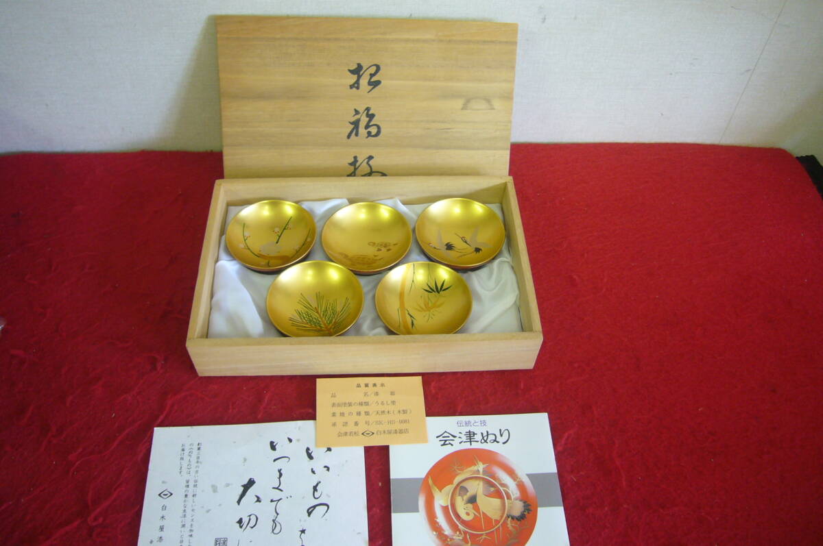 未使用 会津塗 漆器 天然木 松竹梅 鶴亀 酒器 白木屋漆器店 盃 おちょこ 金彩 うるし塗 桐箱入