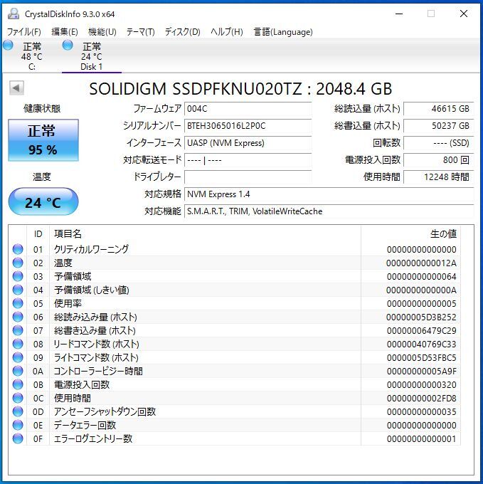 SOLIDIGM 2TB SSD P41 Plus (M.2 / 2280 / NVMe) 動作確認済み 正常:95% 使用:12248時間 (Intel)