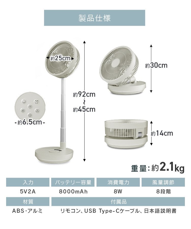 コンセント不要でどこでも使える!リモコン付き 折りたたみ式扇風機です。 ■角度・風量を自由自在に調節! 左右自動首振り・180°角度調節が可能です。 スイッチを押すと左右120度に自動首振りモード、 8段階の風量調節・約45-92cmで無段階で高さ調節が可能です。 シーンや用途に合わせて使えます♪ ■優れた機能性 低騒音かつ長持ち!高性能なDCモーター採用! 消費電力も少なく済むので省エネ対策にも効果的です。 ■便利な機能いろいろ♪ リモコンで遠隔操作が可能!離れた場所からでも操作できます。 自動OFFタイマー機能付き。1-8時間の設定ができます。 LEDライト搭載!夜間の常夜灯としても使用できます。 前面カバーと羽根を取り外して水洗いが可能です。お手入れもラクラク♪ 【商品仕様】 カラー:ソフトグレージュ 商品内容:本体、リモコン、USB Type-cケーブル、日本語取扱説明書 サイズ:(約)幅25×高さ45-93cm 卓上スタイル:(約)高さ30cm 収納スタイル:(約)高さ14cm 重量:(約)2.1kg 風量調節:8段階 入力:5V2A バッテリー容量:(約)8000mAh 消費電力:(約)8W 材質:ABS・アルミ 【注意事項】 ・商品は、モニターによって色合いが異なって見える場合があります。 ・仕様・デザインは改良のため予告なく変更することがあります。 (折りたたみ扇風機 サーキュレーター コンパクトファン) |