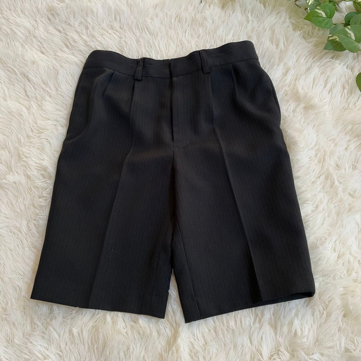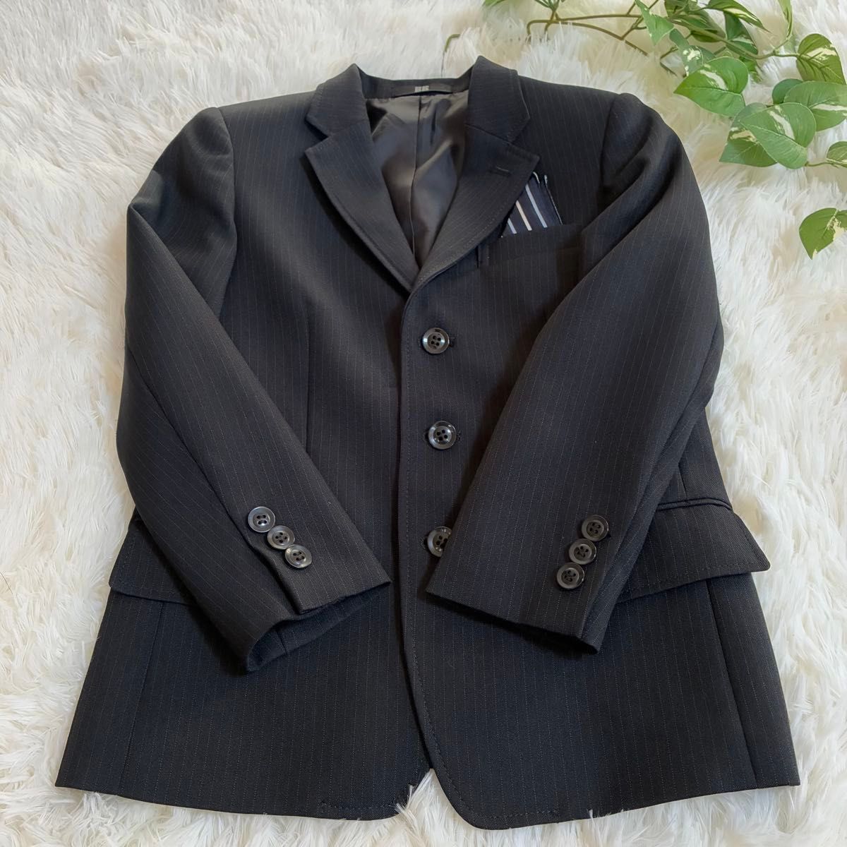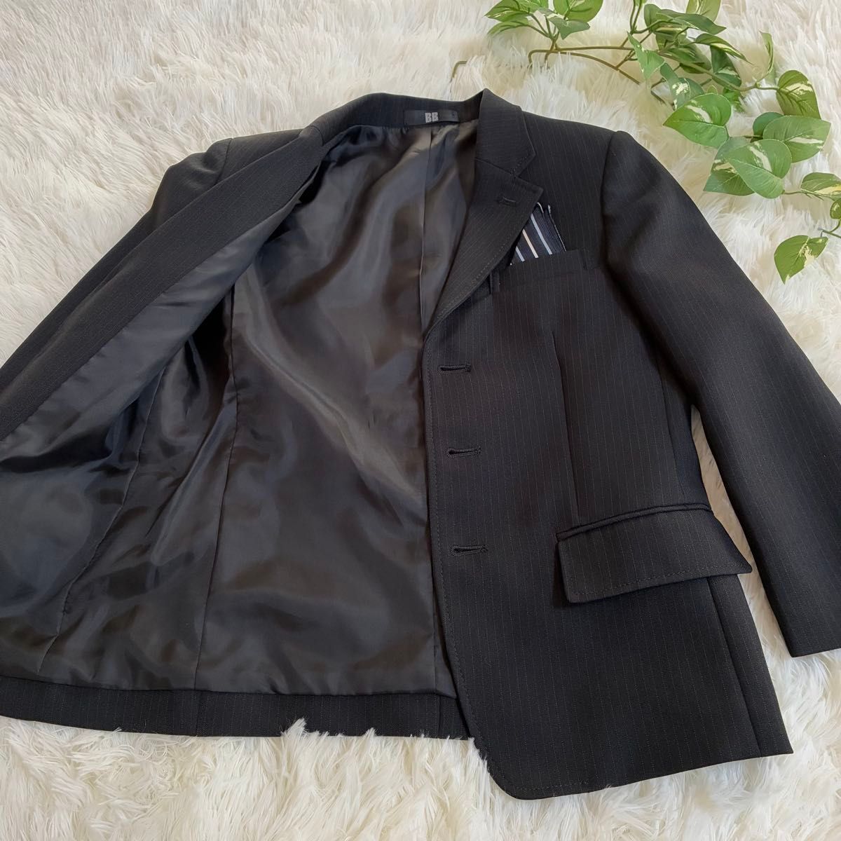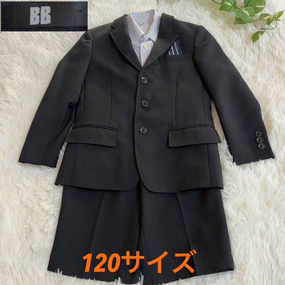 BBの男の子用フォーマルスーツです。ブラックのストライプ柄で、ジャケットとハーフパンツのセットです。入学式や発表会など、様々なフォーマルシーンで活躍します。