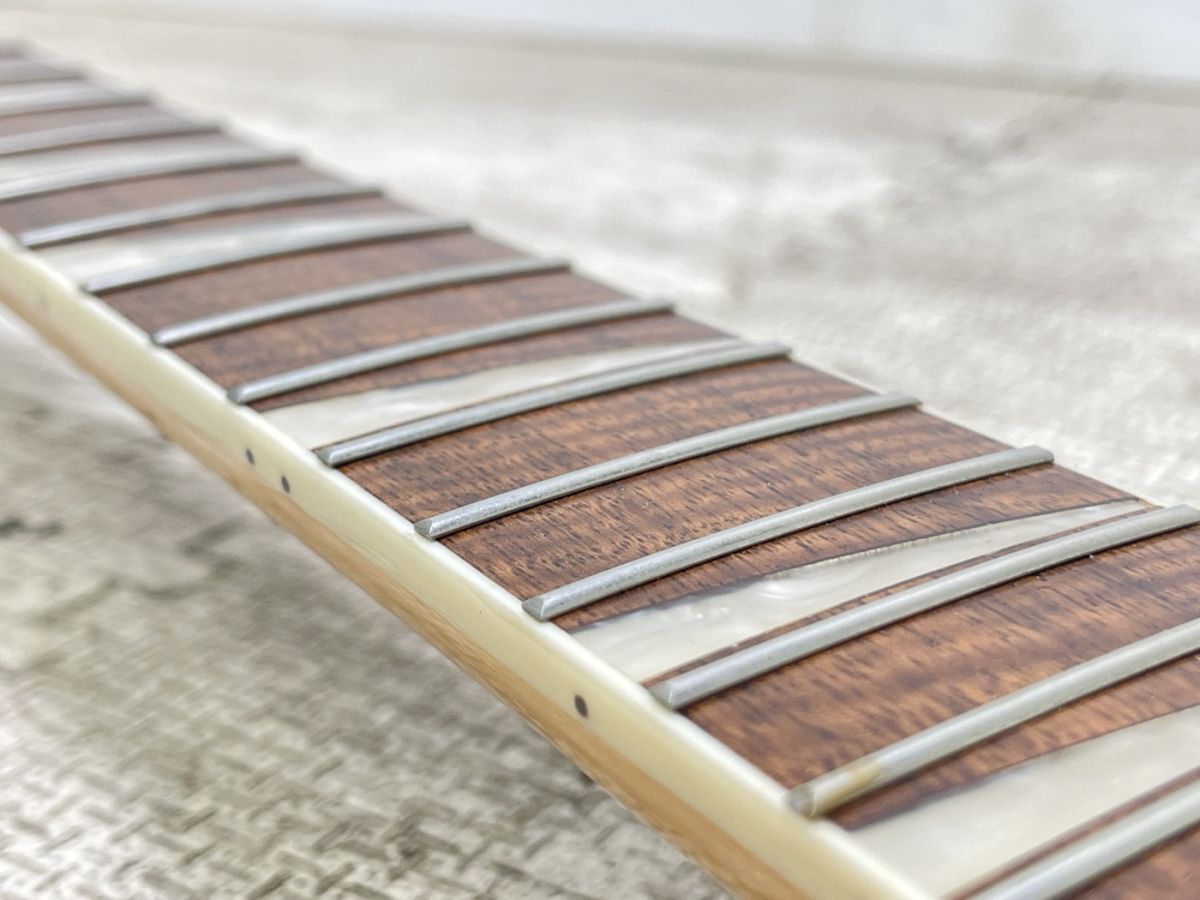 状態は下記の通りです。 PU:不明(それぞれ音は出ました。) ネック:弦を張っていない状況で逆ぞり フレット:軽い浮きが見られる部分あるがスケールを当てると隙間なし トラスロッド:左右余裕ありました。 サーキットなどはどうなっているか不明です。 ジャックが2つあり片方は音が出ませんでした。 ブリッジが欠品しているため弦を張ってのチェックは行なっておりません。 写真に写っている本体のみとなります。 色々自作品のご愛嬌品ということで、ご購入いただければと思います。 |