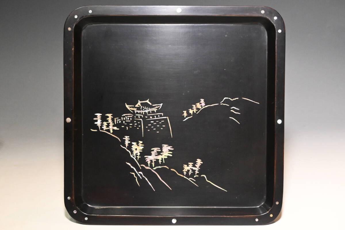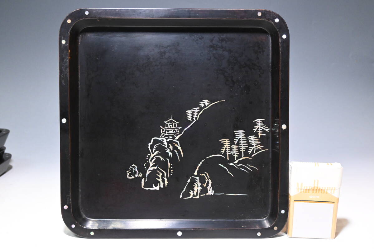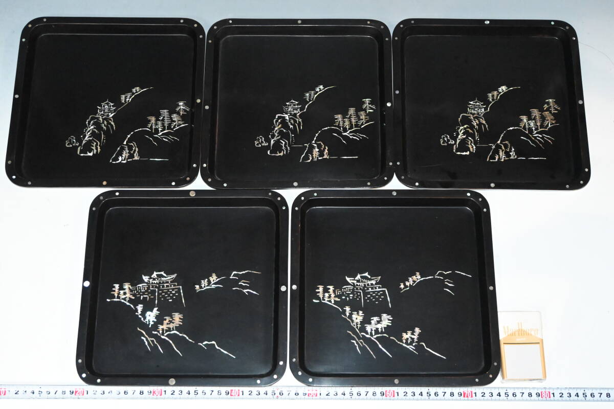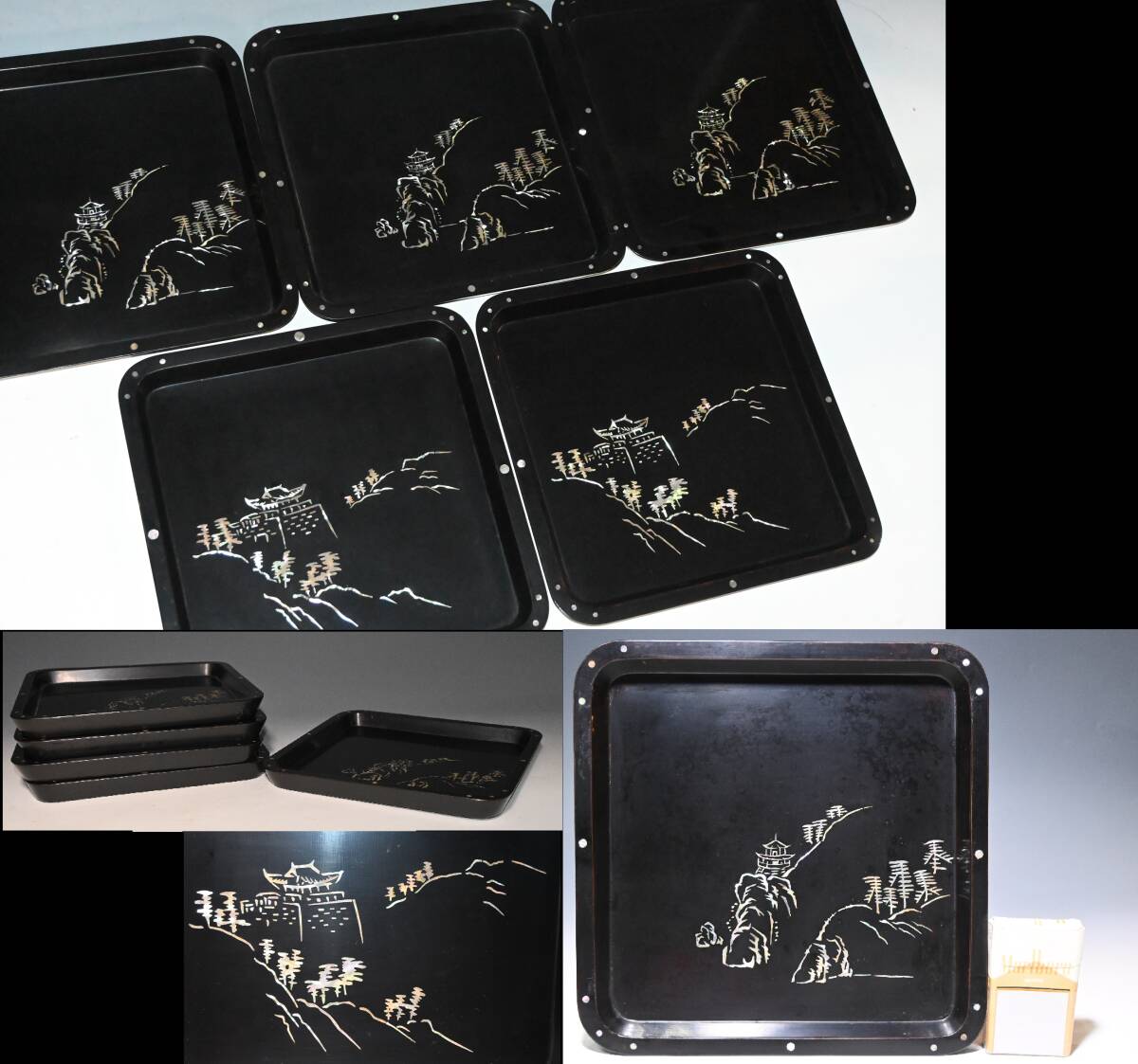 朝鮮美術 螺鈿細工 山水楼閣図 図替 二種 五客 螺鈿漆器 黒漆螺鈿 漆器 漆芸 角盆 御膳 会席膳 菓子器 茶道具 | |||||