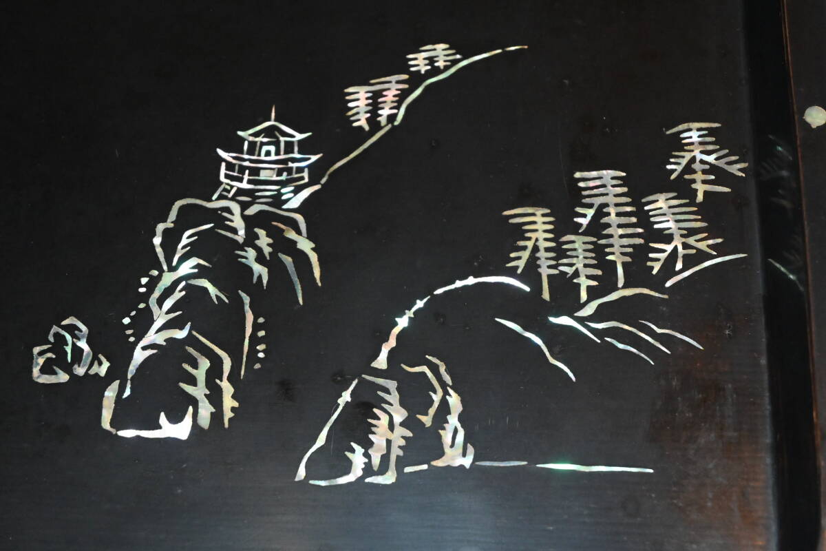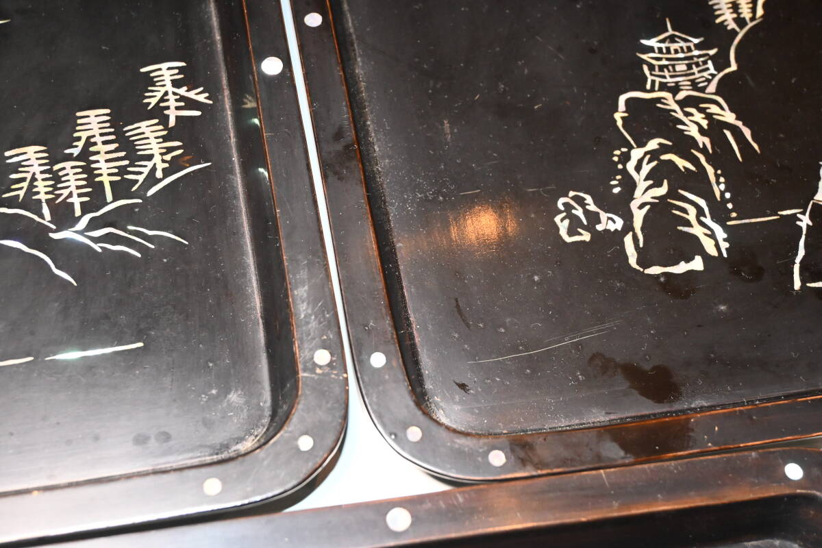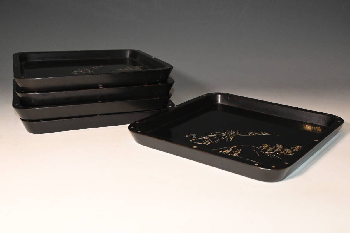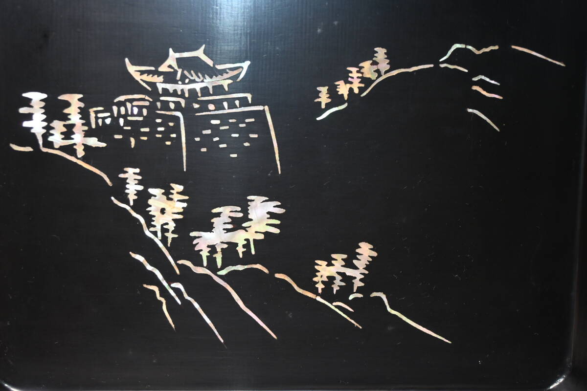 朝鮮美術 螺鈿細工 山水楼閣図 図替 二種 五客 螺鈿漆器 黒漆螺鈿 漆器 漆芸 角盆 御膳 会席膳 菓子器 茶道具 | |||||