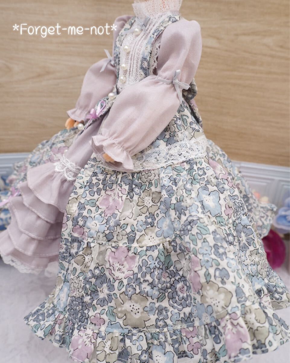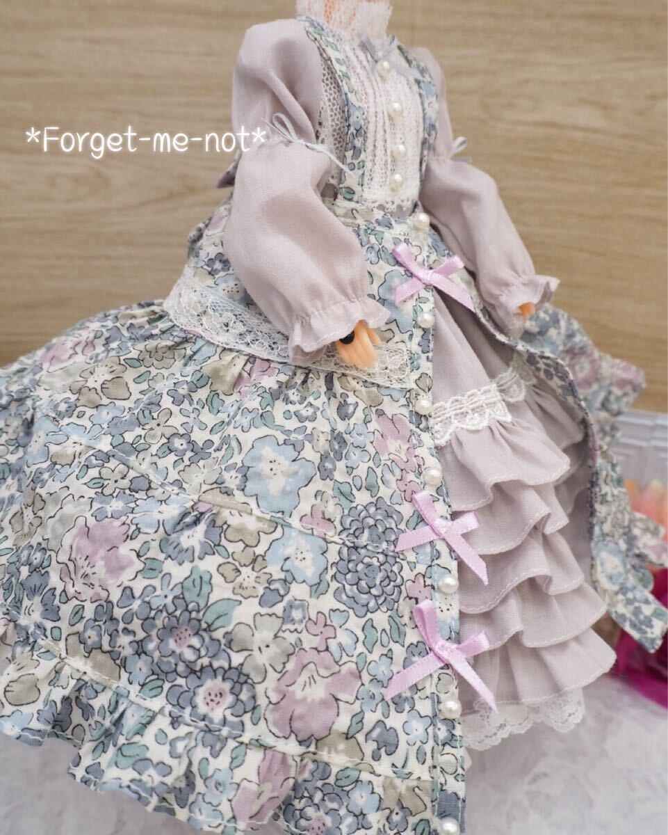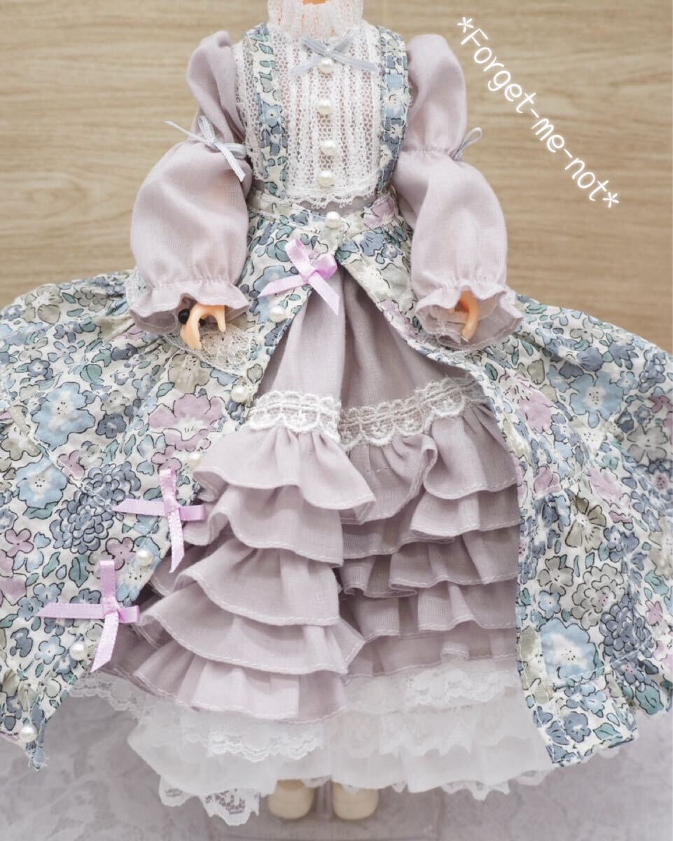 | たくさんある中からご覧いただきましてありがとうございます!トルソー着画のため、どうしてもスカートや袖の丈感等が分かりづらいかと思います。ご不便をおかけ致しますがどうぞ宜しくお願い致します 27センチドール、デフォルトボディに合わせて作りましたドレスのセットになります。(o^^o) 『~すみれ色の歌~』 静かな洋館に響く、小さな歌声。 それは、すみれ色のドレスをまとうお姫様の夢。 フリルとレースを重ねたドレスは、まるで秘密のブーケ。 花柄のエプロンを羽織れば、庭園の散歩へ。 純白のアンダースカートは、どんな物語にもなれる魔法。 優しさと可憐さをぎゅっと詰め込んだ、Forget-me-notだけの特別な1着。 小さな物語を奏でる、大切なアウトフィットセットです。 貴方の大切なドールにぜひどうぞ。 ★ワンピース、後ろ半開マジックテープ留め ★オーバーワンピース、前全開スナップ留め。リバティのリップル布で作りました。ちりめんのように布がぽこぽこしています。 ★アンダースカート、ウエストゴム。 ★ヘッドドレス、リボンを結んでください。リバティのリップル布 以上の4点セットになります |