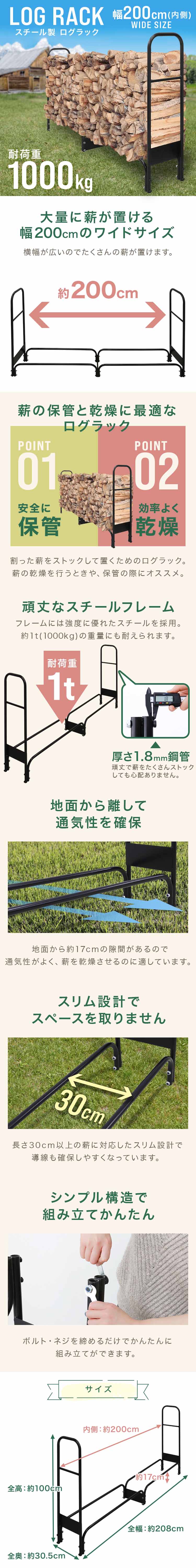 | 薪の保管と乾燥に最適なログラックです。 フレームには強度に優れたスチールを採用。 約1t(1000kg)の重量にも耐えられます! 地面から約17cmの隙間があるので通気性がよく、薪を乾燥させるのに適してます。 また、スリム設計でスペースを取らず収納できます! 簡単な組み立て式! シンプル構造なので、ストレスなく組立てご使用いただけます。 【商品仕様】 カラー:ブラック 耐荷重(約):1000kg サイズ(約) ・外寸:幅208cm×奥行30.5cm×高さ100cm ・内寸:幅200cm 【注意事項】 ・商品はモニターによって色合いが異なって見える場合があります。 ・仕様/デザインは改良のため予告なく変更することがあります。 |