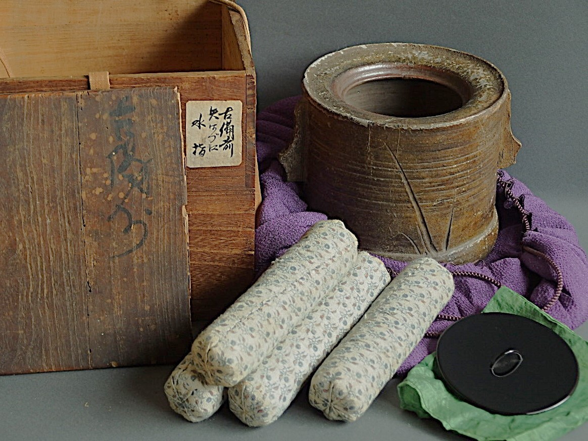 時代の桐箱と御物袋、塗蓋の布袋、箱の四隅に詰める江戸更紗製の枕が付属します。