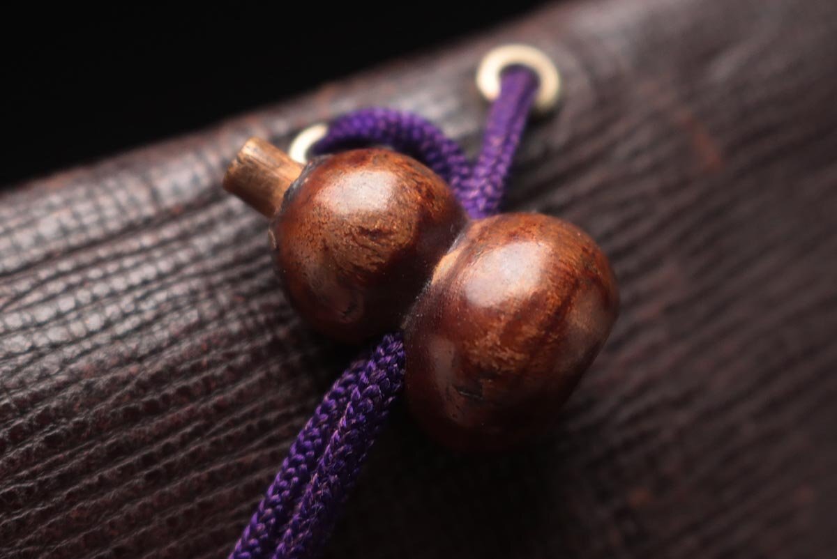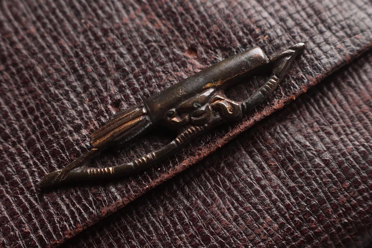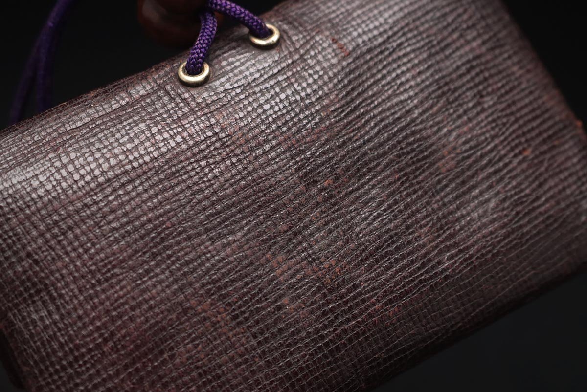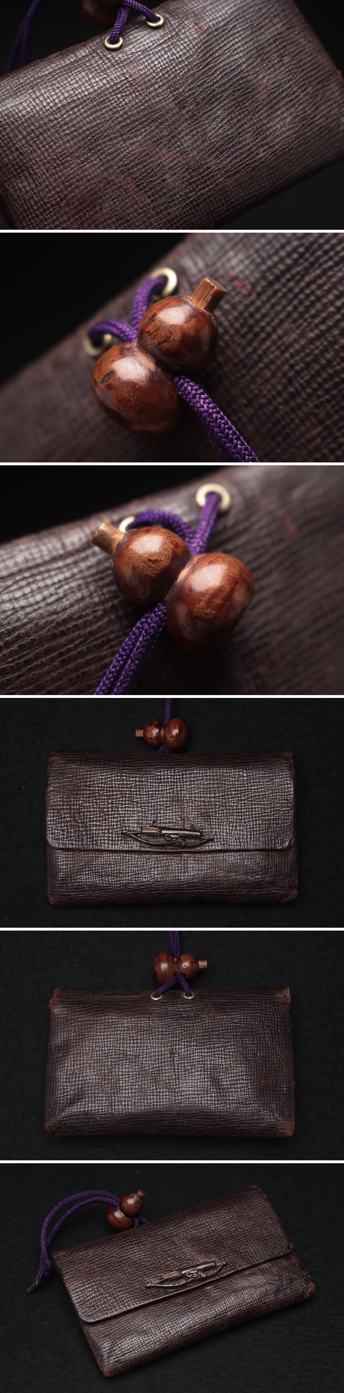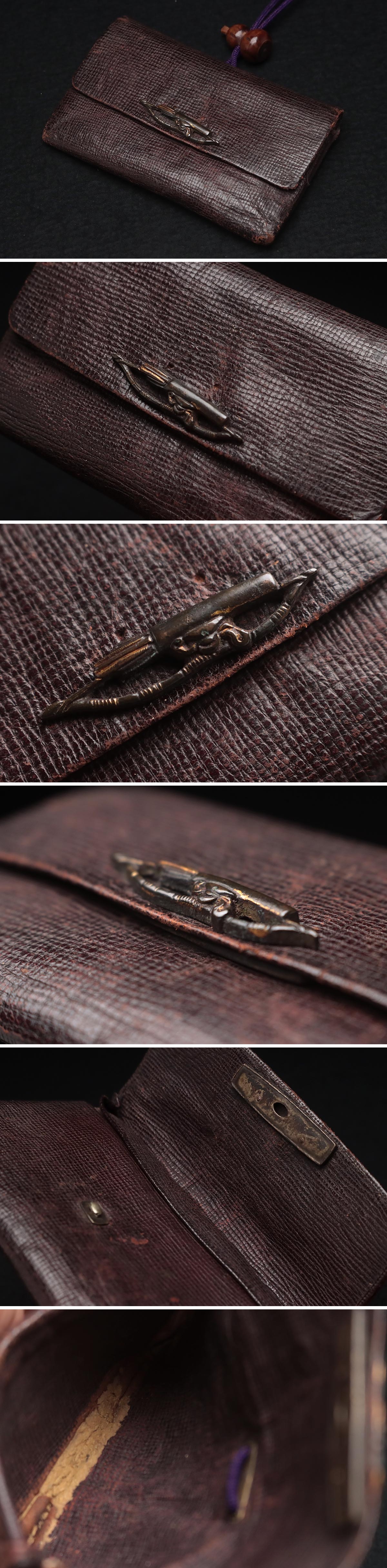 | ◆ 時代喫煙具 銅地金色絵弓矢図前金具 革製煙草入・革製叺 木彫瓢緒締・莨入・たばこ入 提げ物 装飾具 古美術 ◆
