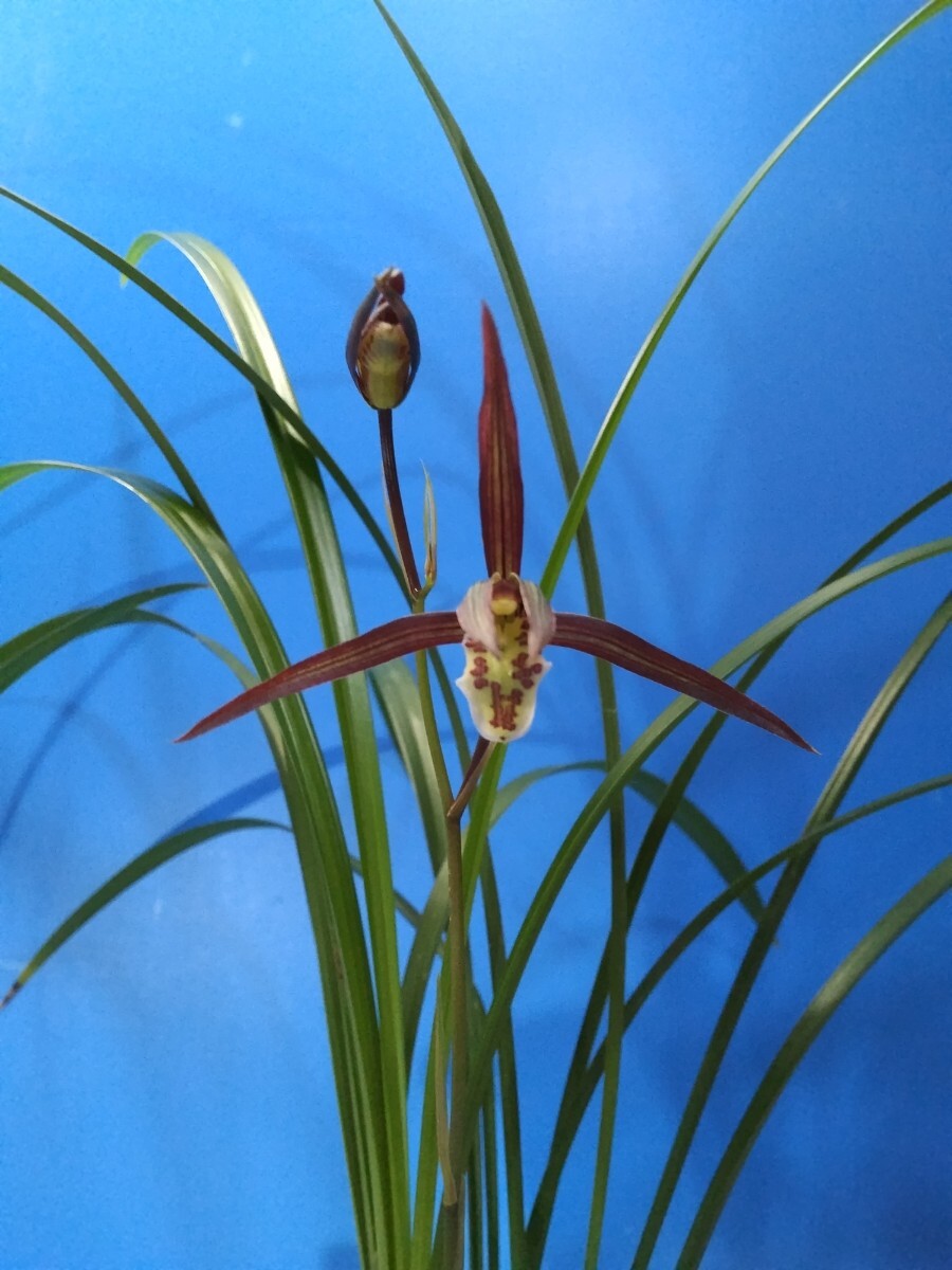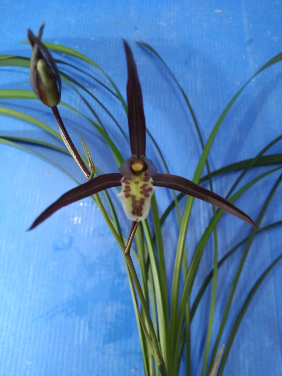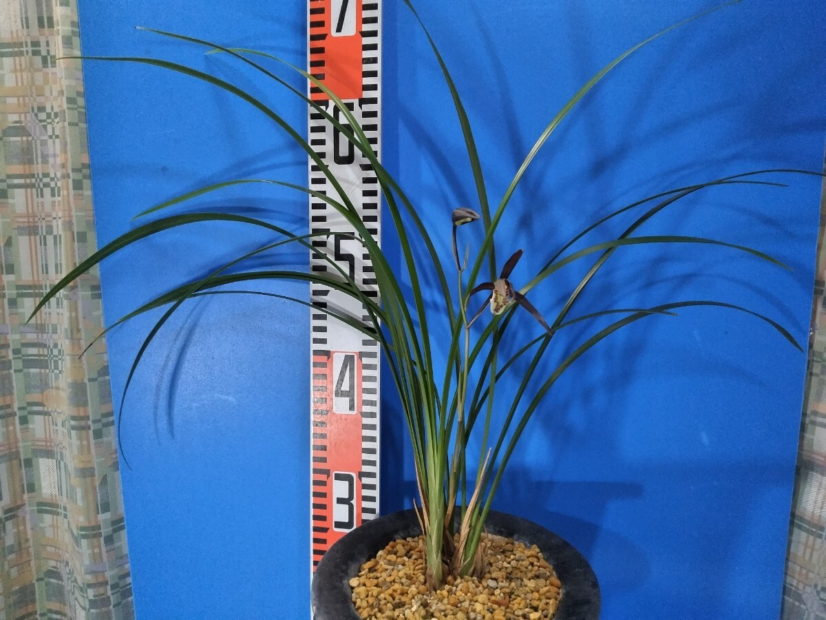 薩摩寒蘭登録「薩摩黒宝」黒紅平肩咲き中輪です。
