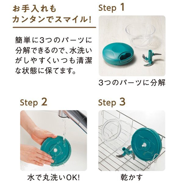 | ハンドルを引っ張るだけでみじん切りが簡単♪ ハンドルを引っ張る回数を変えて、出来上がりの細かさを調節☆ |